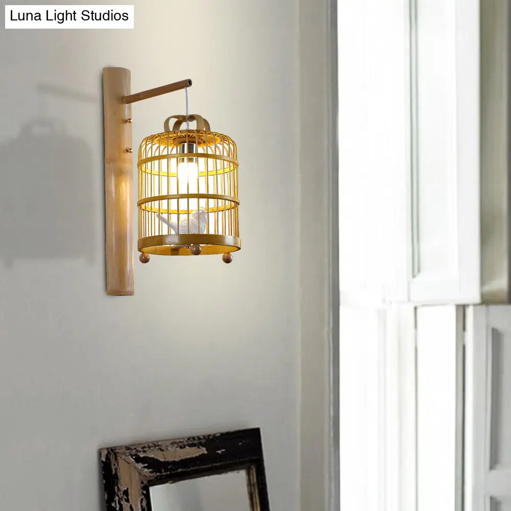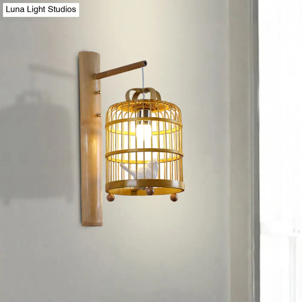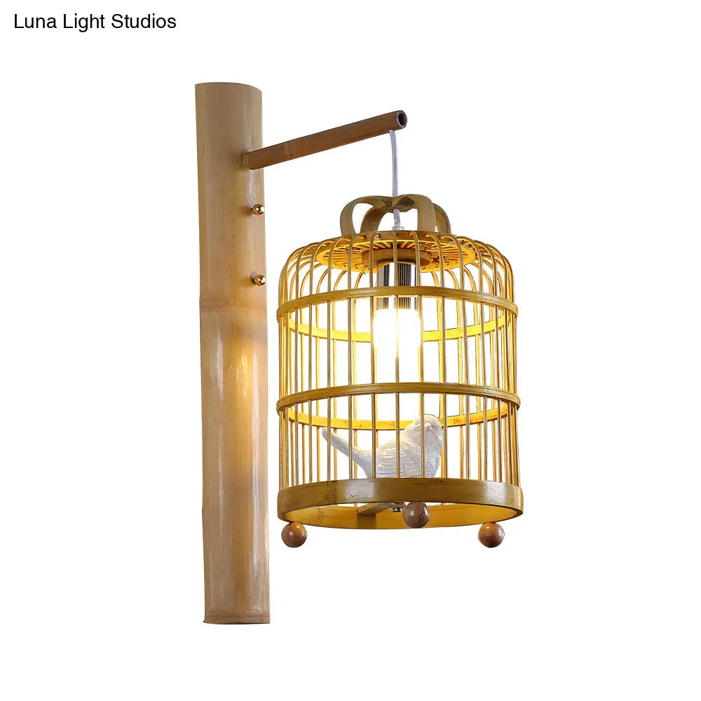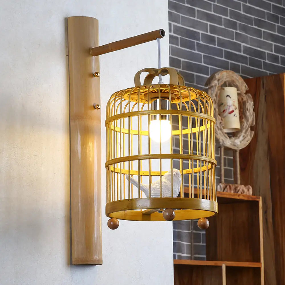 ديكوربايتس™ مصباح حائط من الخيزران بتصميم آسيوي - تصميم قفص خشبي، لمبة واحدة، ديكور طائر أبيض