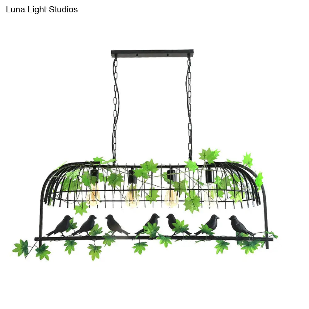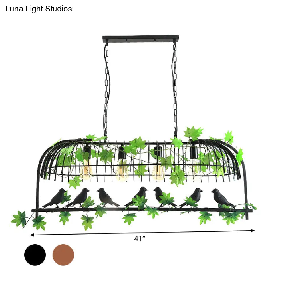 مصباح جزيرة غرفة الطعام المصنوع من الحديد الصناعي على شكل قفص طيور من DecorBites™ - أسود/برونزي معلق مع نبات زخرفي وطائر