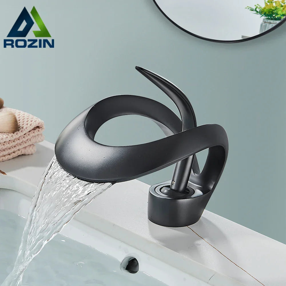 صنبور حوض ديكوربايتس™ أسود اللون، خلاط شلال رمادي، ساخن وبارد، حديث من النحاس، مثبت على السطح
