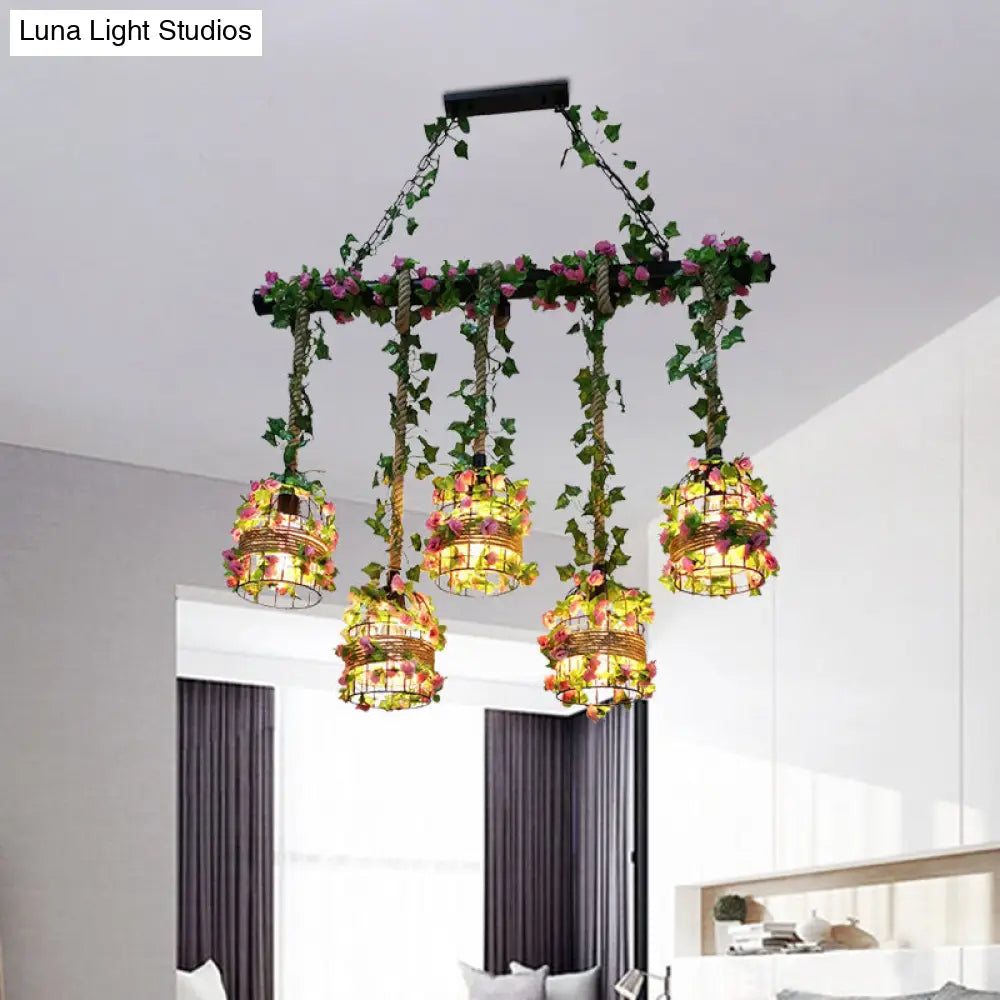 ديكوربايتس™ - مصباح معلق معدني على شكل قفص طيور أسود مع كرمة ورد: 5 مصابيح إضاءة حبلية للجزيرة
