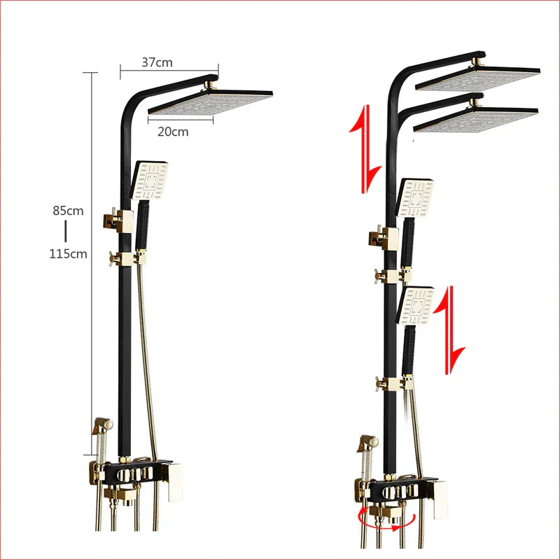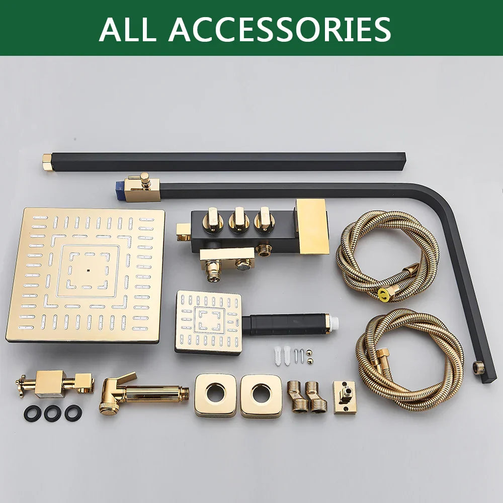 نقدم لكم مجموعة صنبور دش بيديه باللون الأسود الذهبي من Decorbites مع صنبور خلاط دش يدوي، وهو مزيج مثالي بين الأناقة والوظيفة لحمامك المعاصر.