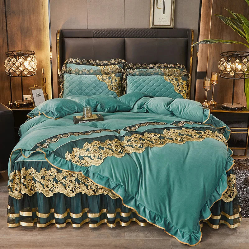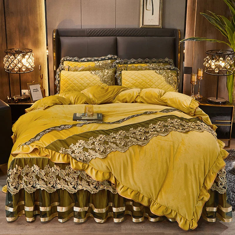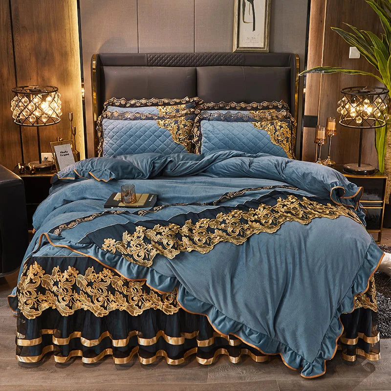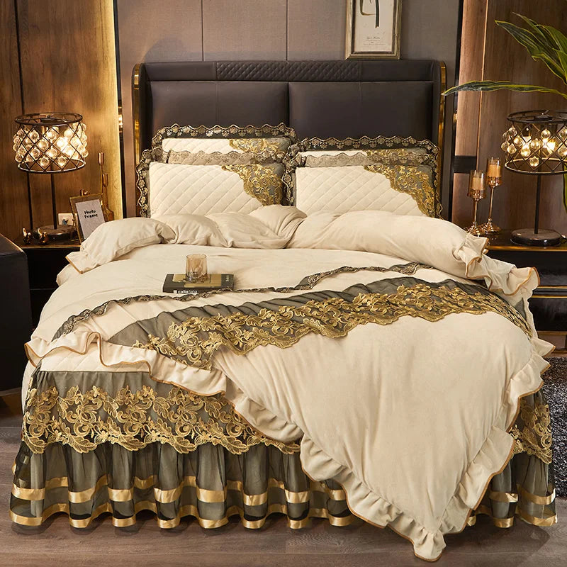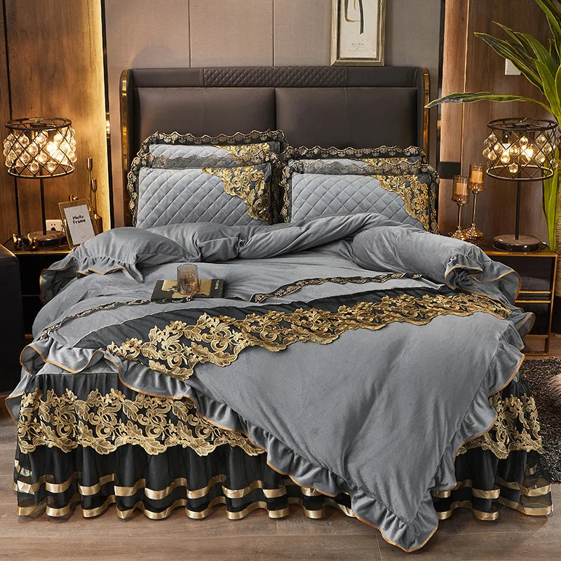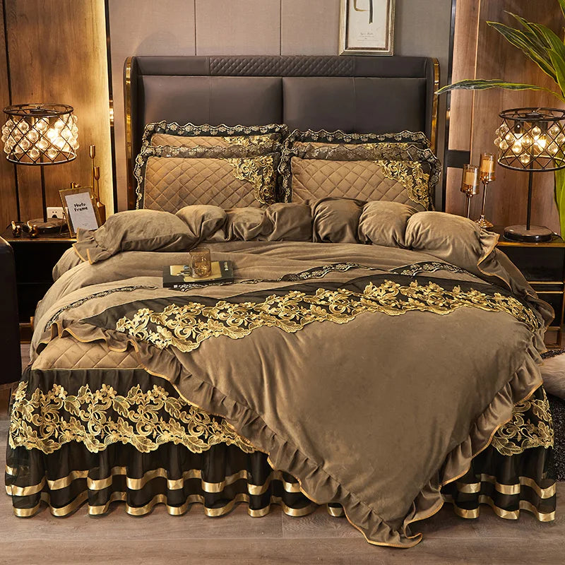 طقم لحاف DecorBites™ من الدانتيل الأسود الذهبي، مخمل كريستالي فاخر، تطريز مبطن، أغطية سرير مكشكشة