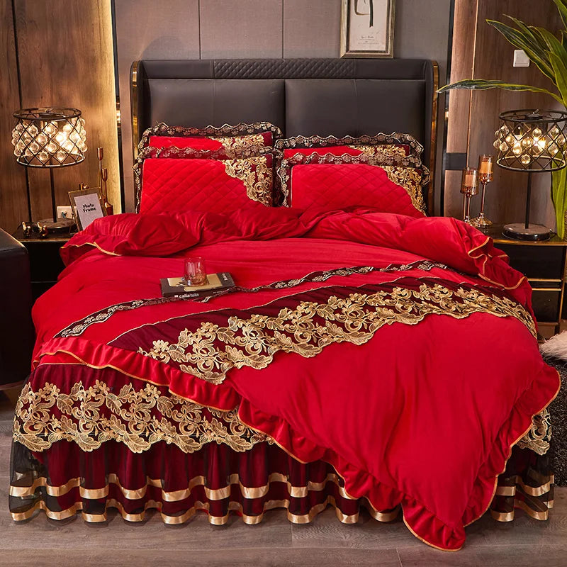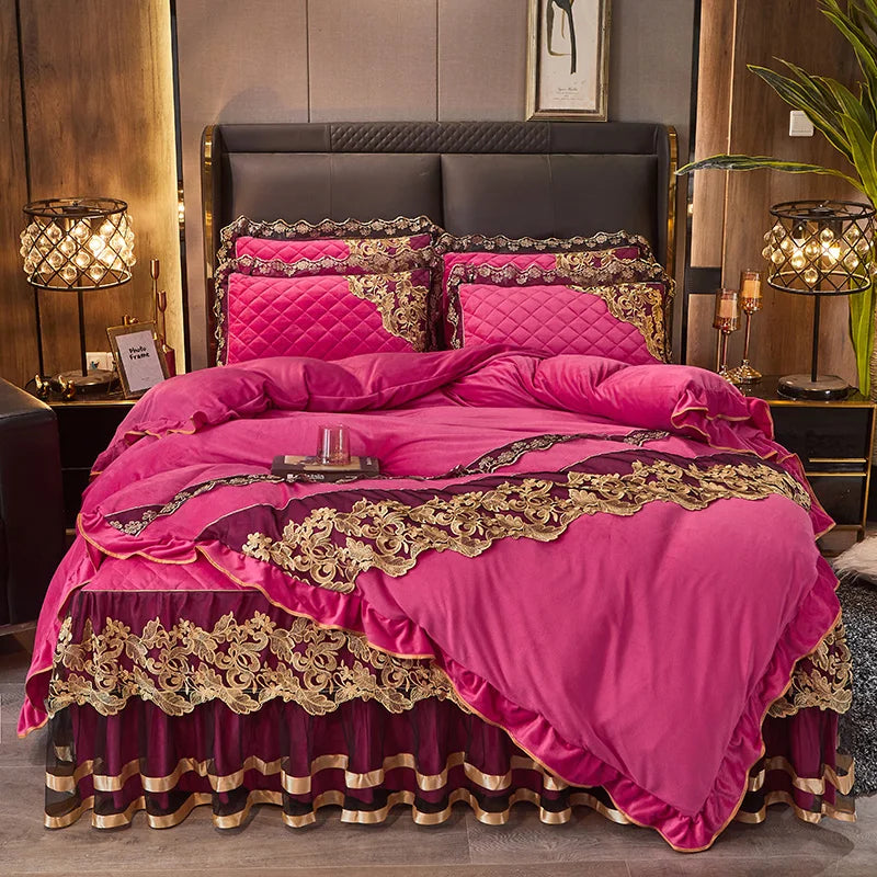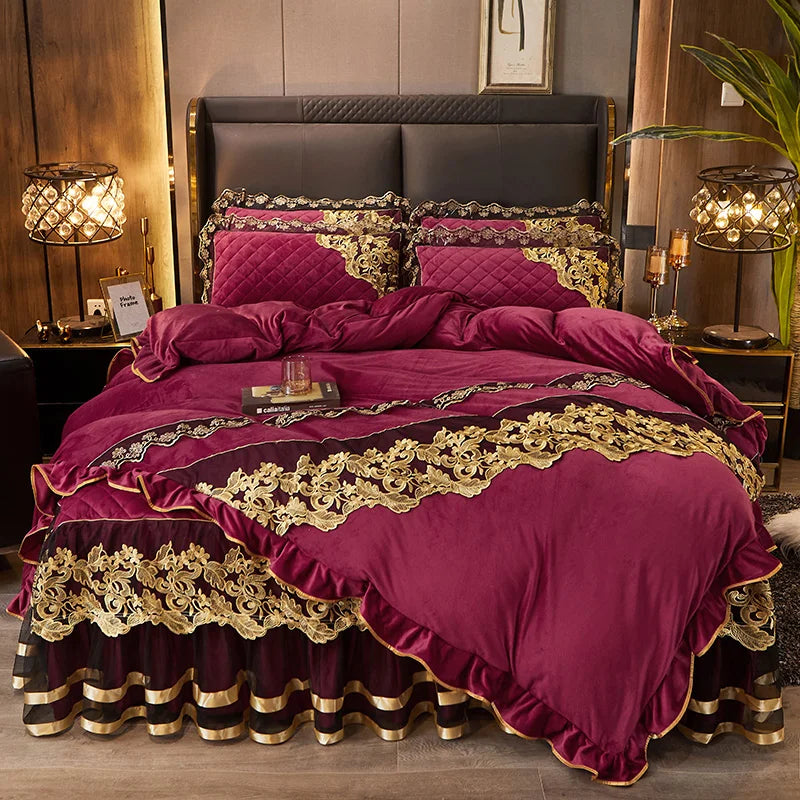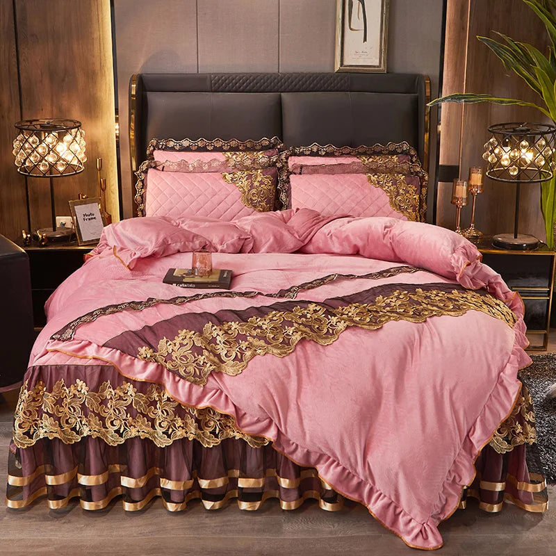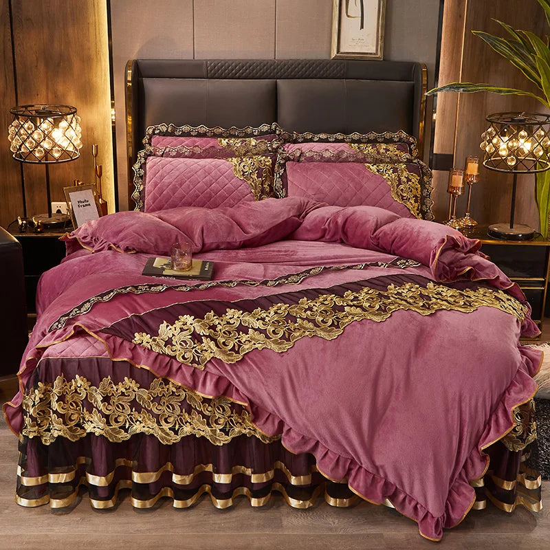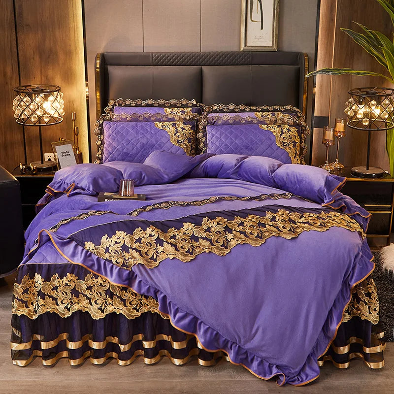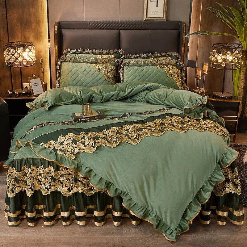طقم لحاف DecorBites™ من الدانتيل الأسود الذهبي، مخمل كريستالي فاخر، تطريز مبطن، أغطية سرير مكشكشة