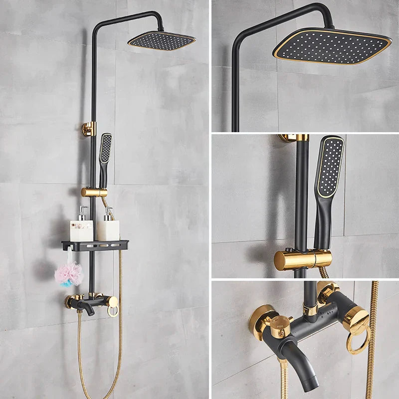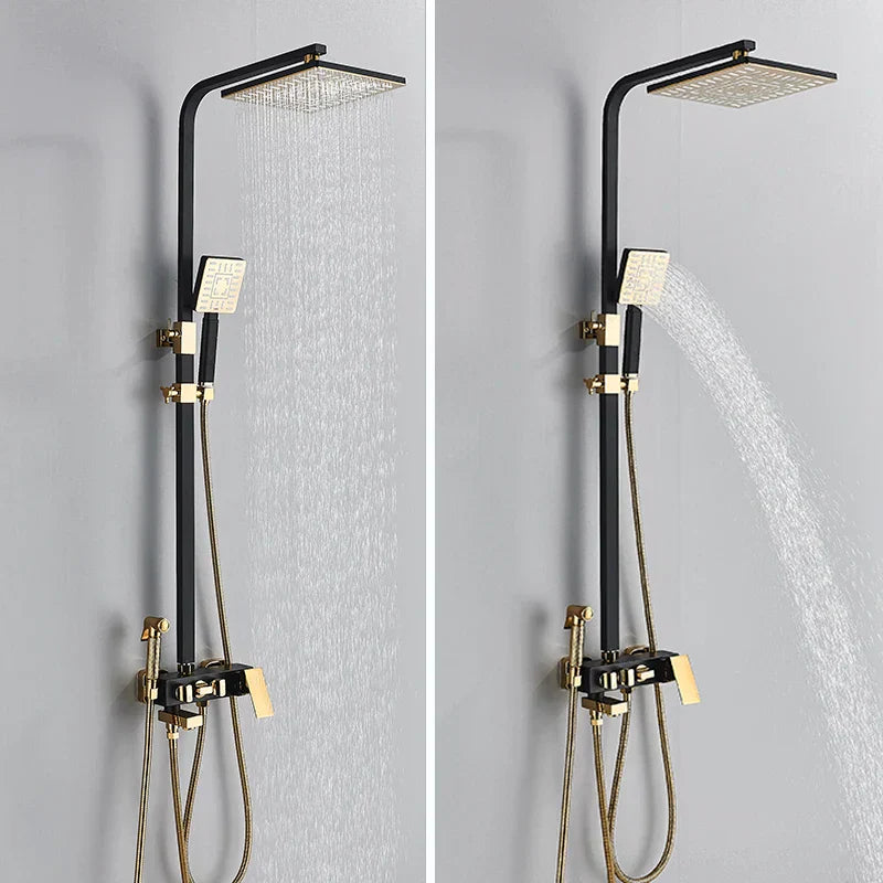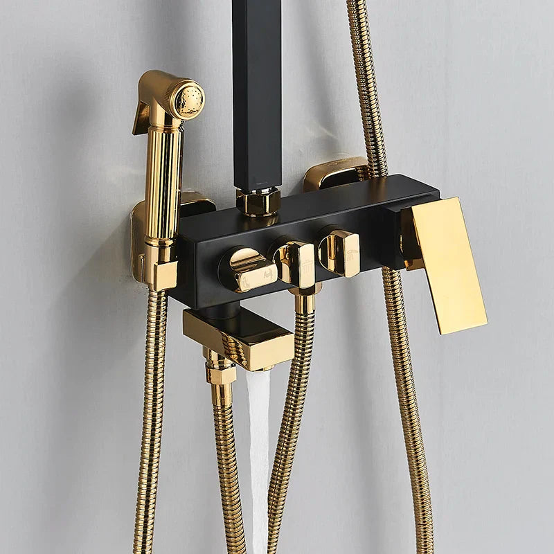 مجموعة حنفية دش DecorBites™ باللون الأسود الذهبي مع وظيفة بيديه، وخلاط مياه الأمطار مثبت على الحائط