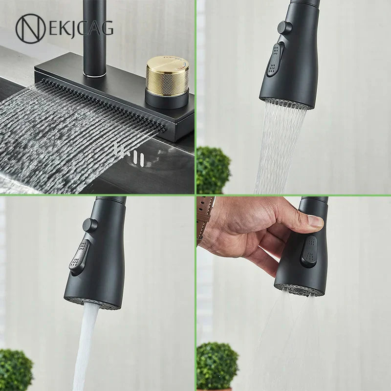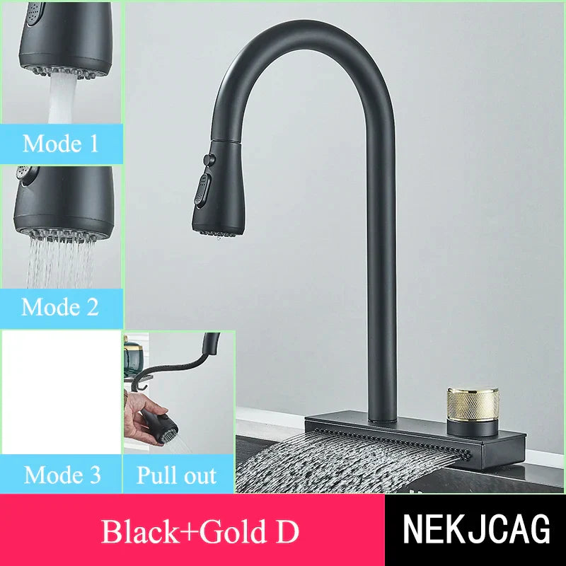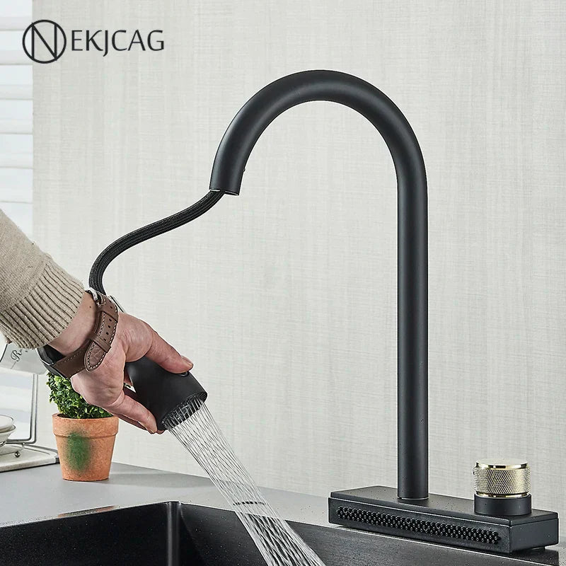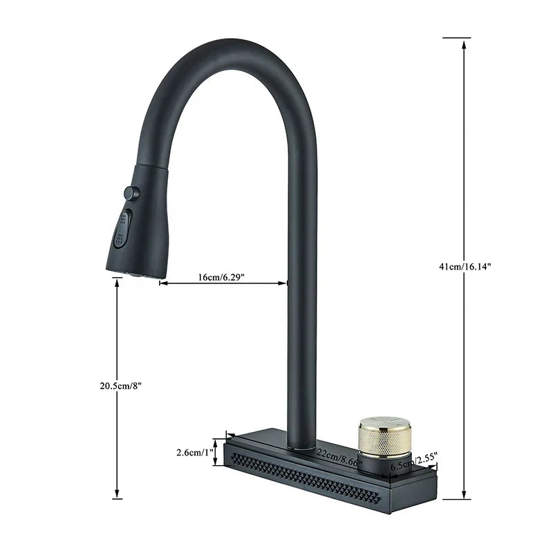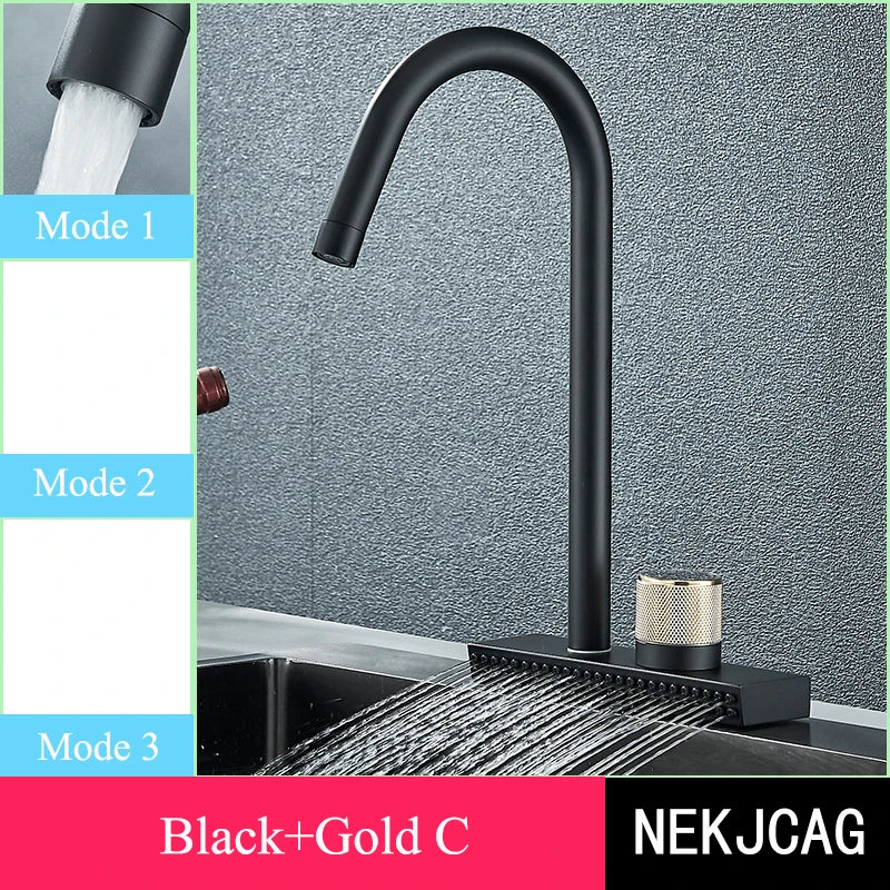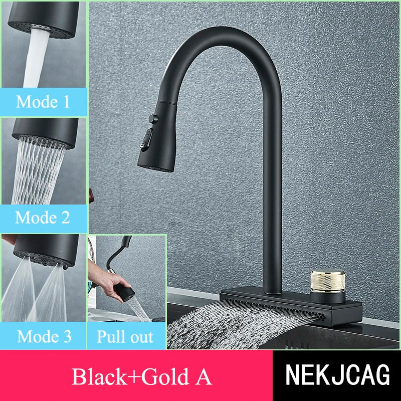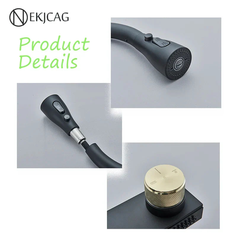 يجمع هذا الصنبور العصري بين وظيفة الماء البارد والساخن، ويتميز بسطح أسود فريد مع لمسات ذهبية رقيقة، مما يجعله قطعةً مميزةً في أي مطبخ. فوهة الرش القابلة للسحب تُضفي راحةً على مختلف مهام المطبخ، بينما يوفر تصميمه الدوار مرونةً وسهولةً في الاستخدام.