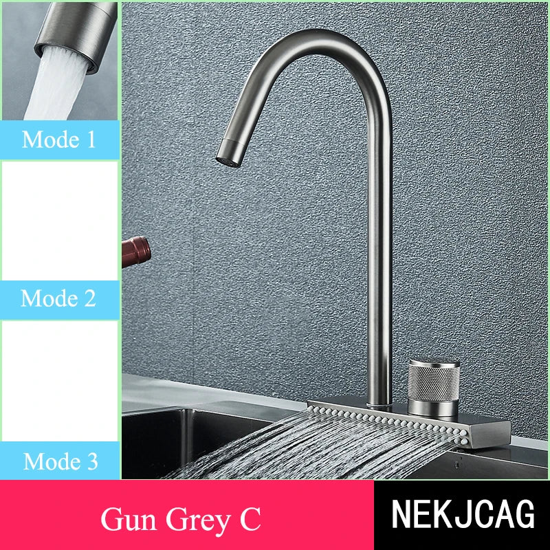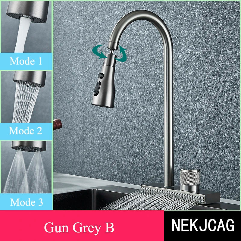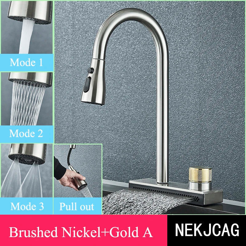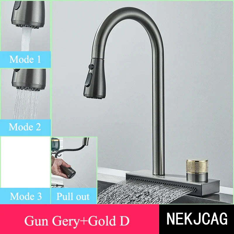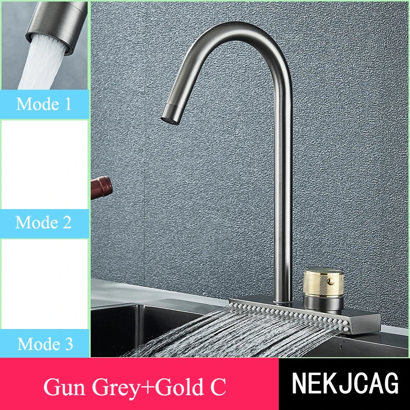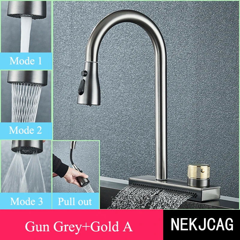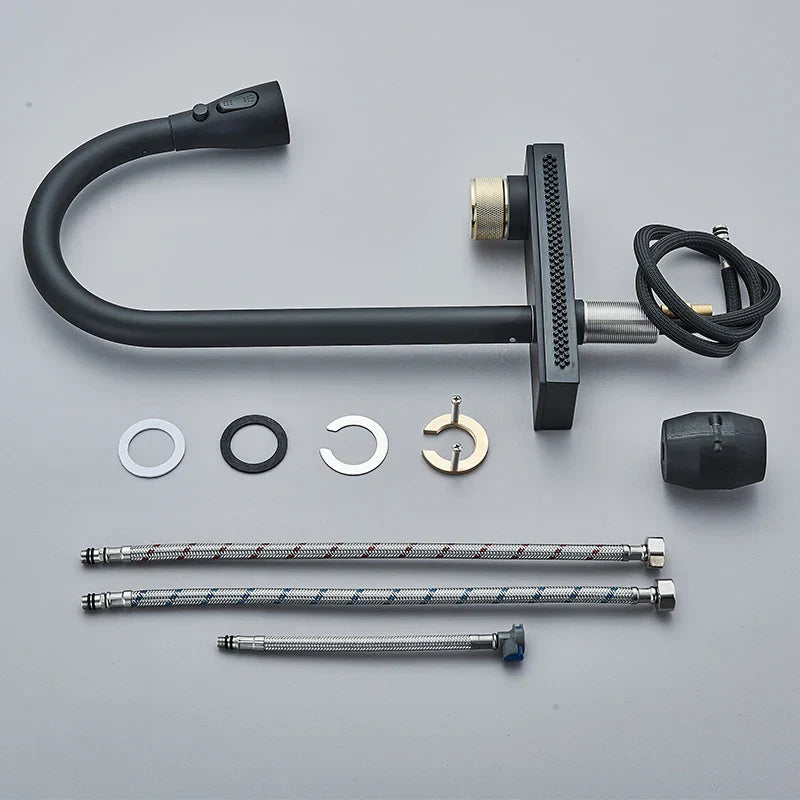 يجمع هذا الصنبور العصري بين وظيفة الماء البارد والساخن، ويتميز بسطح أسود فريد مع لمسات ذهبية رقيقة، مما يجعله قطعةً مميزةً في أي مطبخ. فوهة الرش القابلة للسحب تُضفي راحةً على مختلف مهام المطبخ، بينما يوفر تصميمه الدوار مرونةً وسهولةً في الاستخدام.