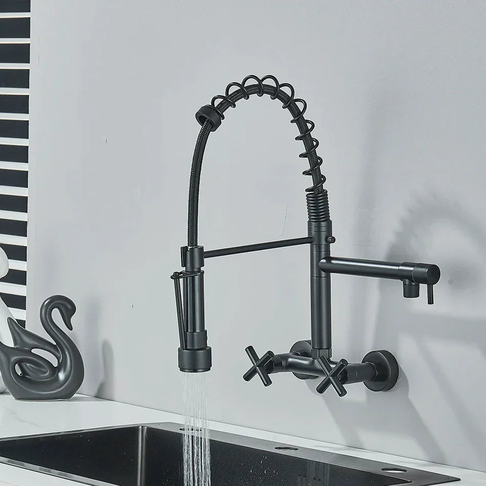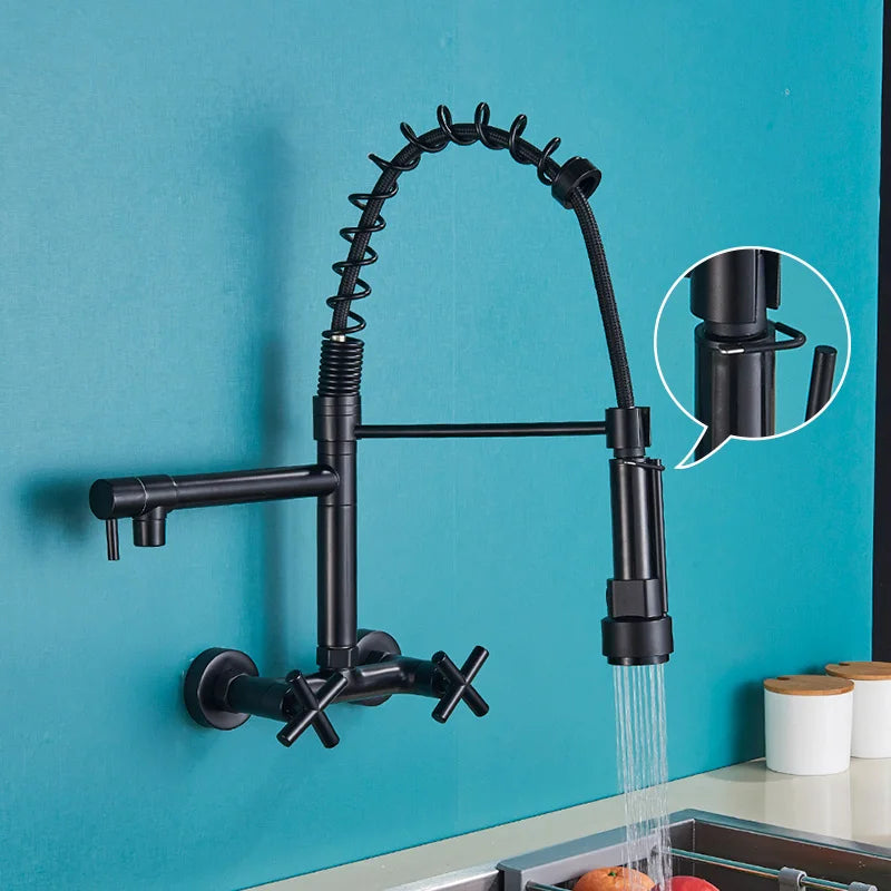 صنبور مطبخ أسود من DecorBites™ مثبت على الحائط مزود بفوهتين دوارتين وخلاط حوض غسيل