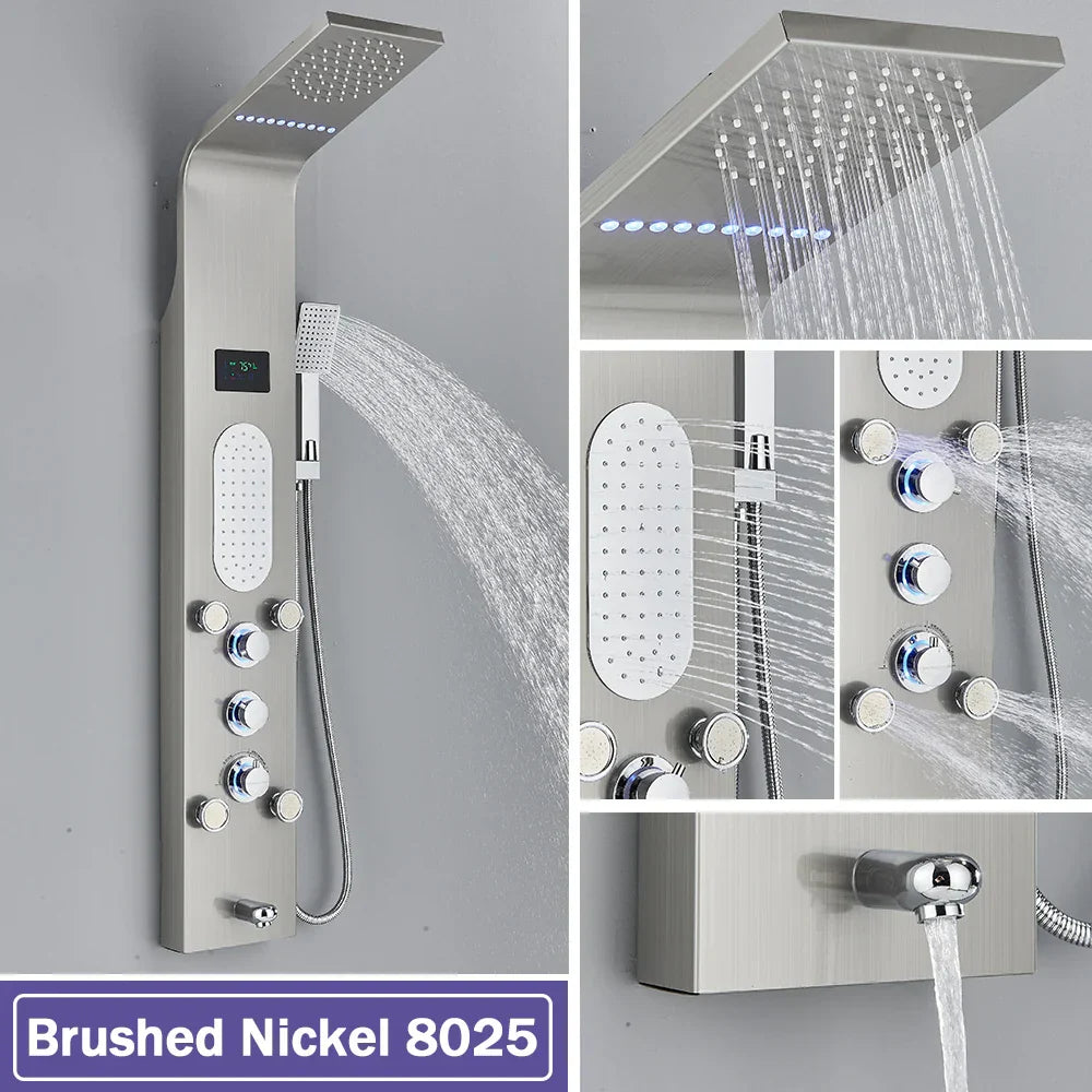 حسّن تجربة الاستحمام مع لوحة دش ديكوربيتس السوداء LED بتصميم شلال المطر مع بخاخ تدليك وحنفية بيديه. توفر هذه اللوحة الرائعة تجربة استحمام فاخرة لا مثيل لها.