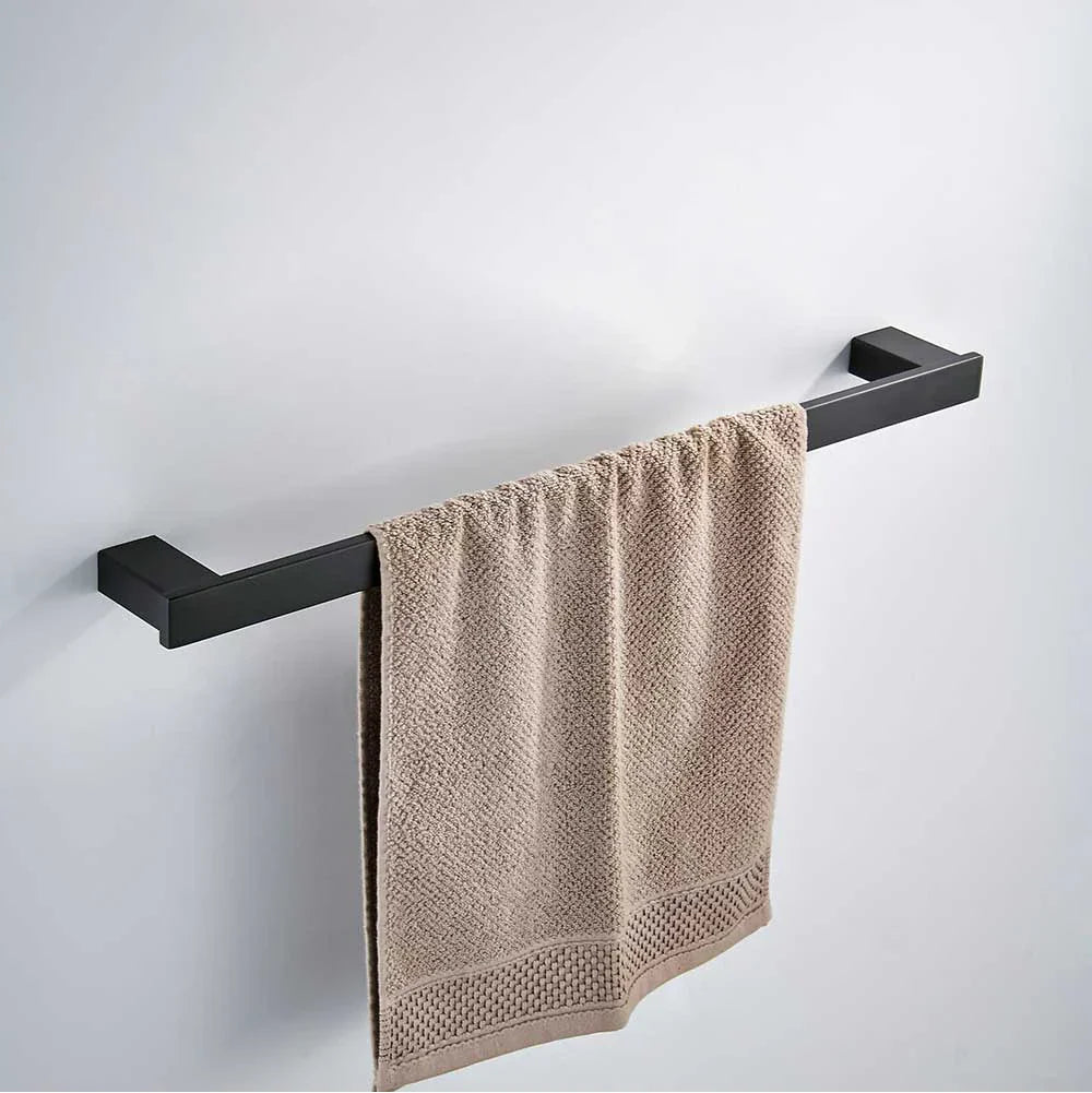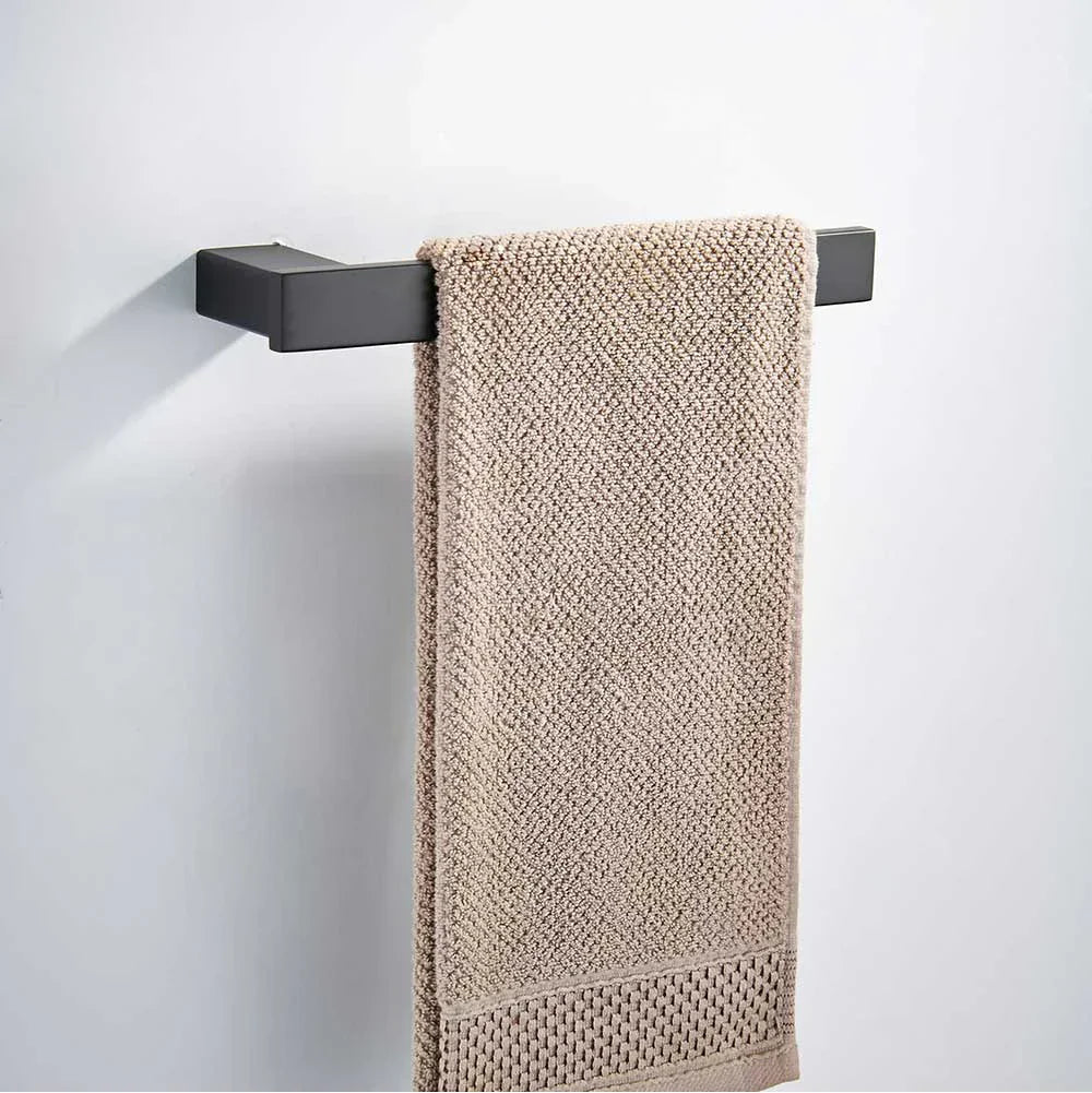 تتضمن المجموعة حامل ورق أسود غير لامع، مثالي لتنظيم وعرض مستلزمات حمامك. يوفر حامل المناشف الفردي حلاً عمليًا وأنيقًا لتعليق المناشف، بينما يضفي خطاف الفولاذ المقاوم للصدأ لمسة من الأناقة على مساحتك.