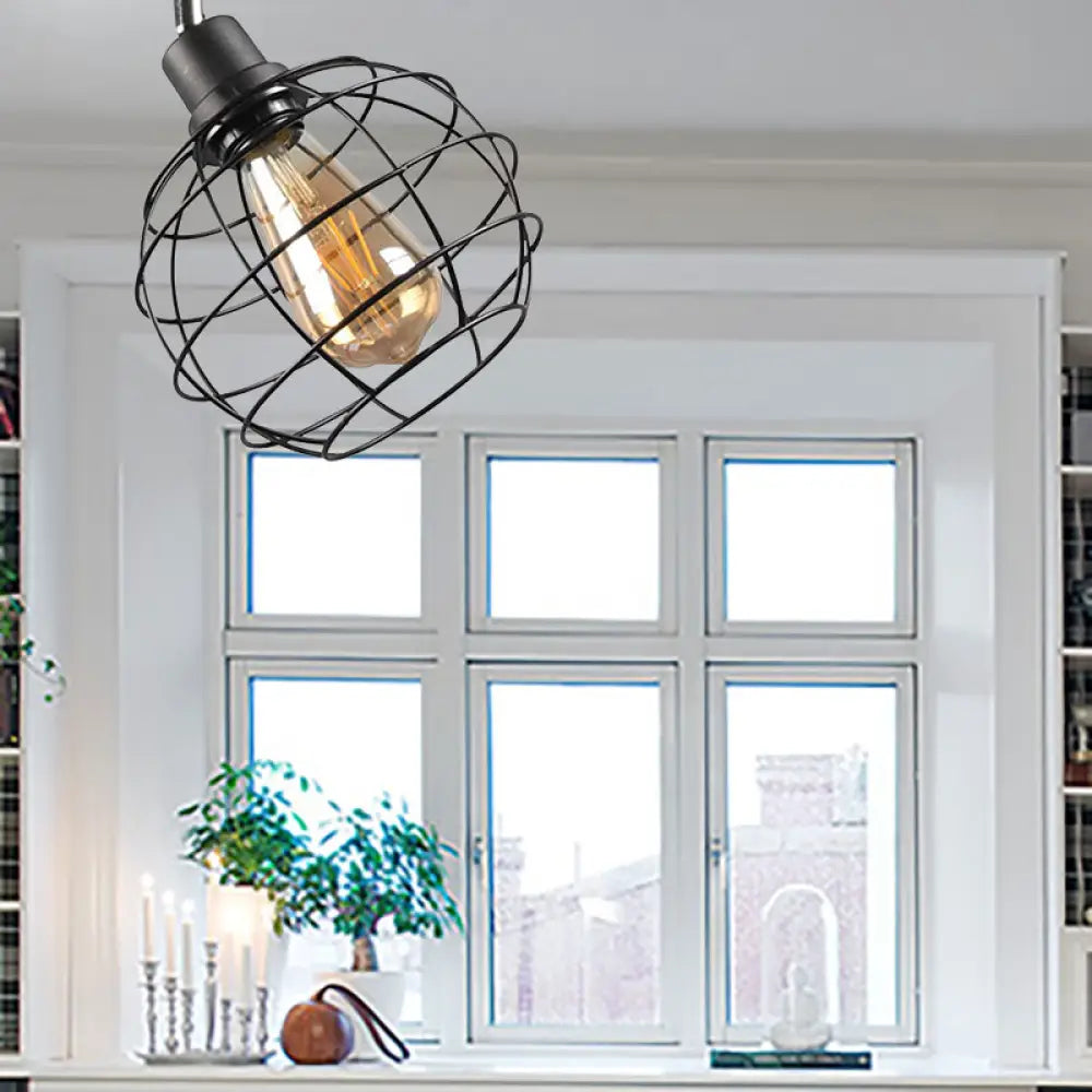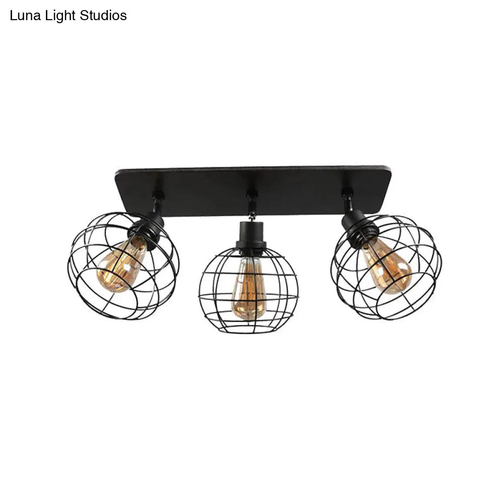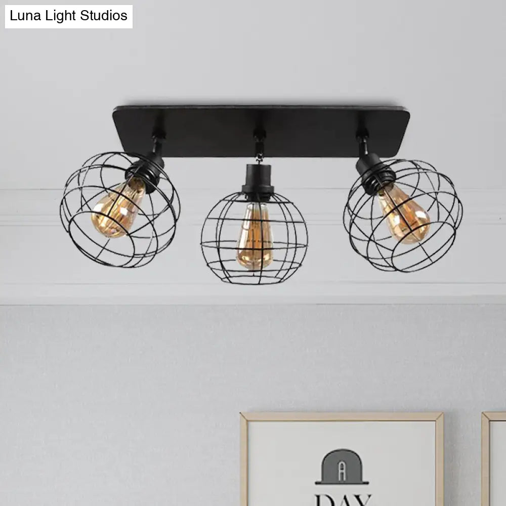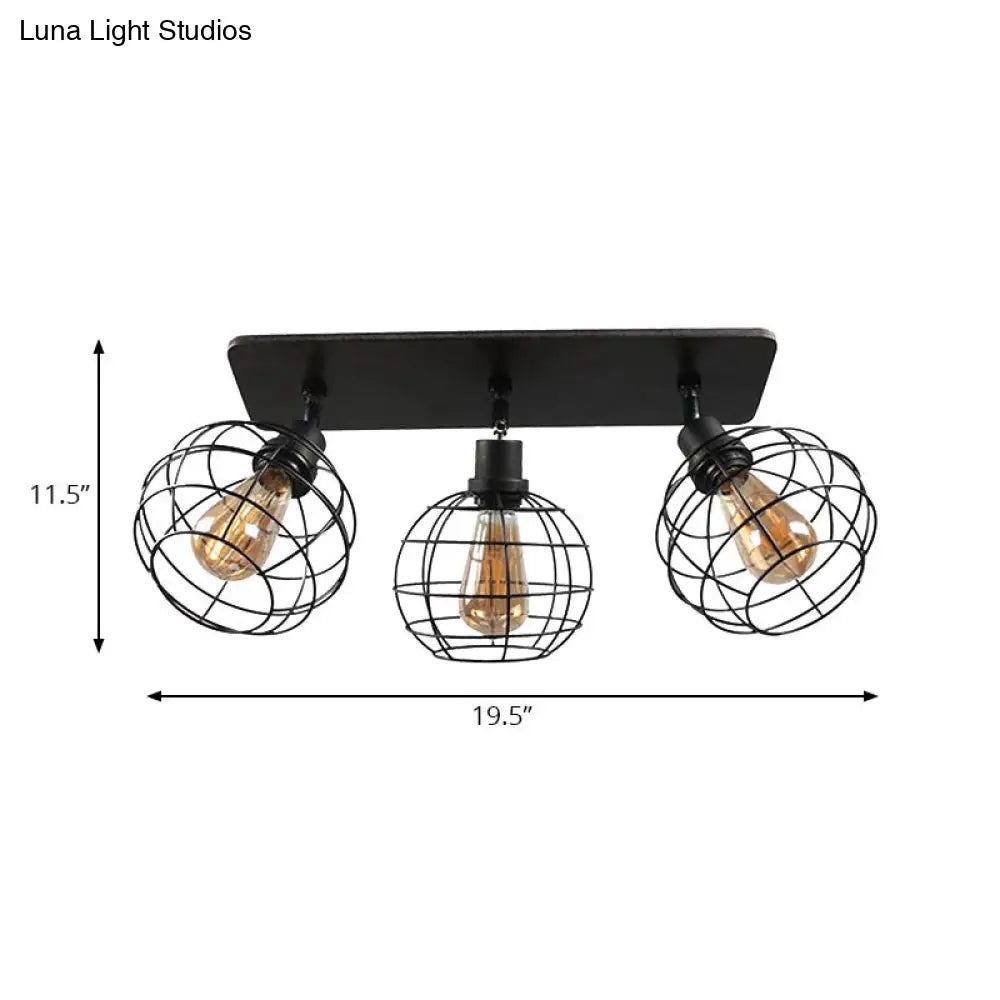 وحدة إضاءة سقف دوارة معدنية سوداء من DecorBites™ للمطاعم - تصميم قفص شبه مسطح صناعي مع رؤوس 1/2/3
