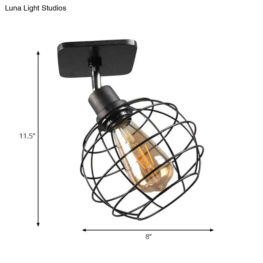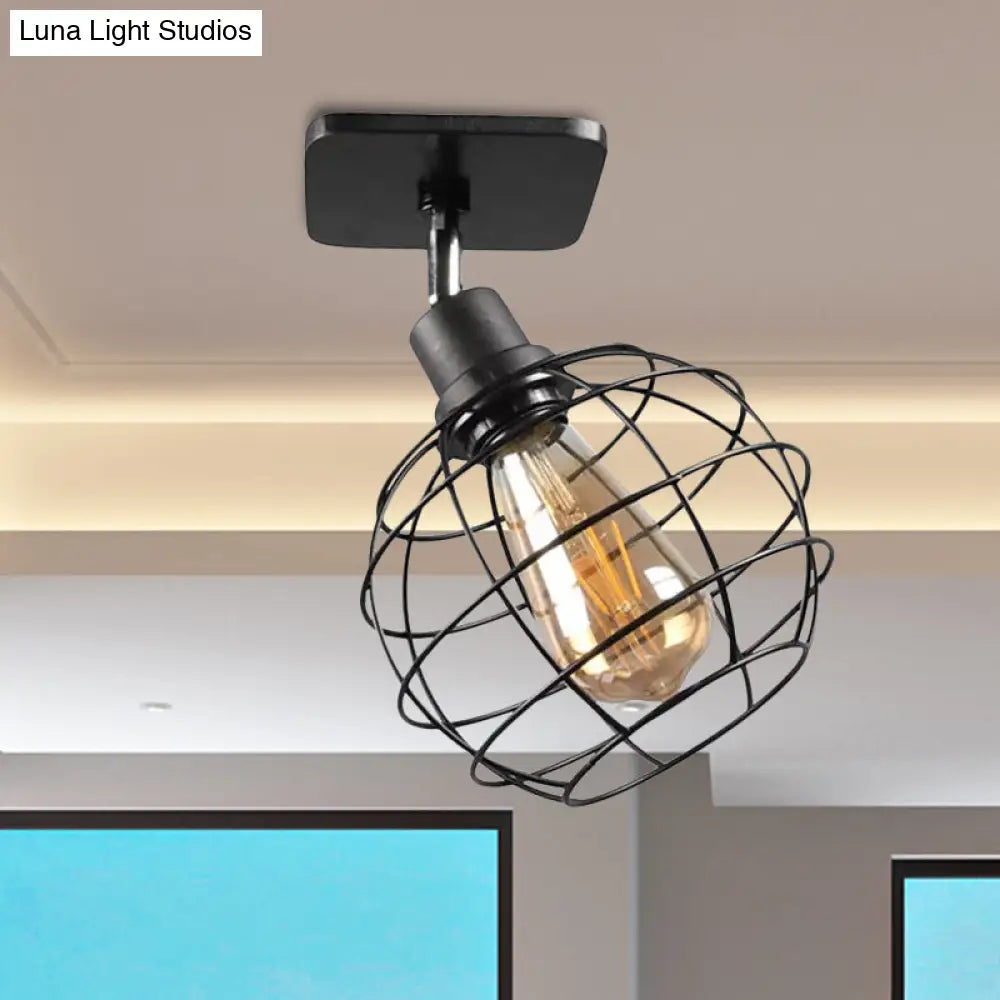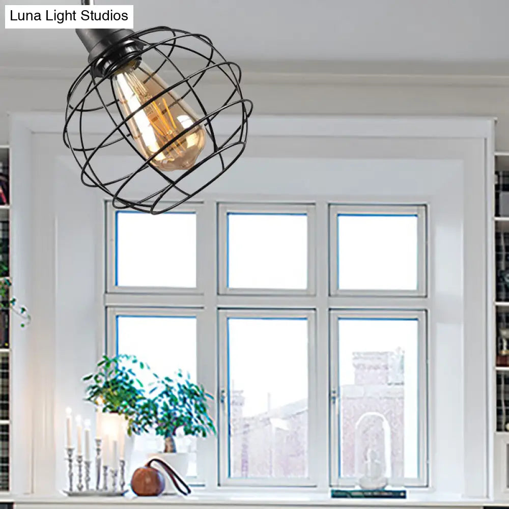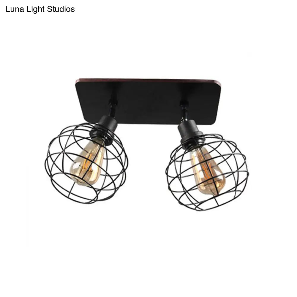 وحدة إضاءة سقف دوارة معدنية سوداء من DecorBites™ للمطاعم - تصميم قفص شبه مسطح صناعي مع رؤوس 1/2/3