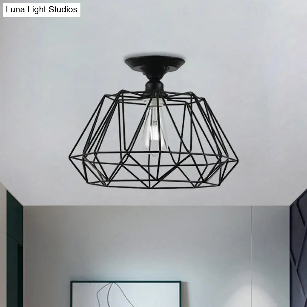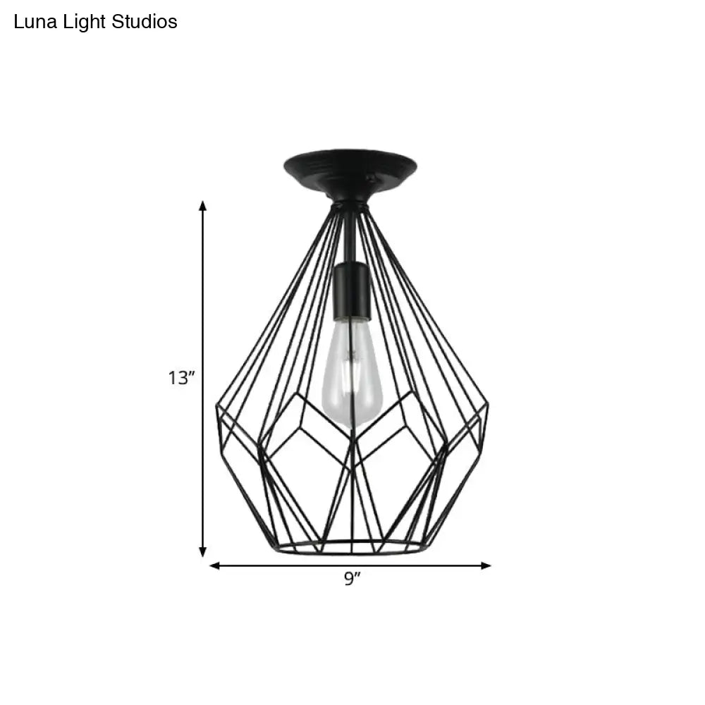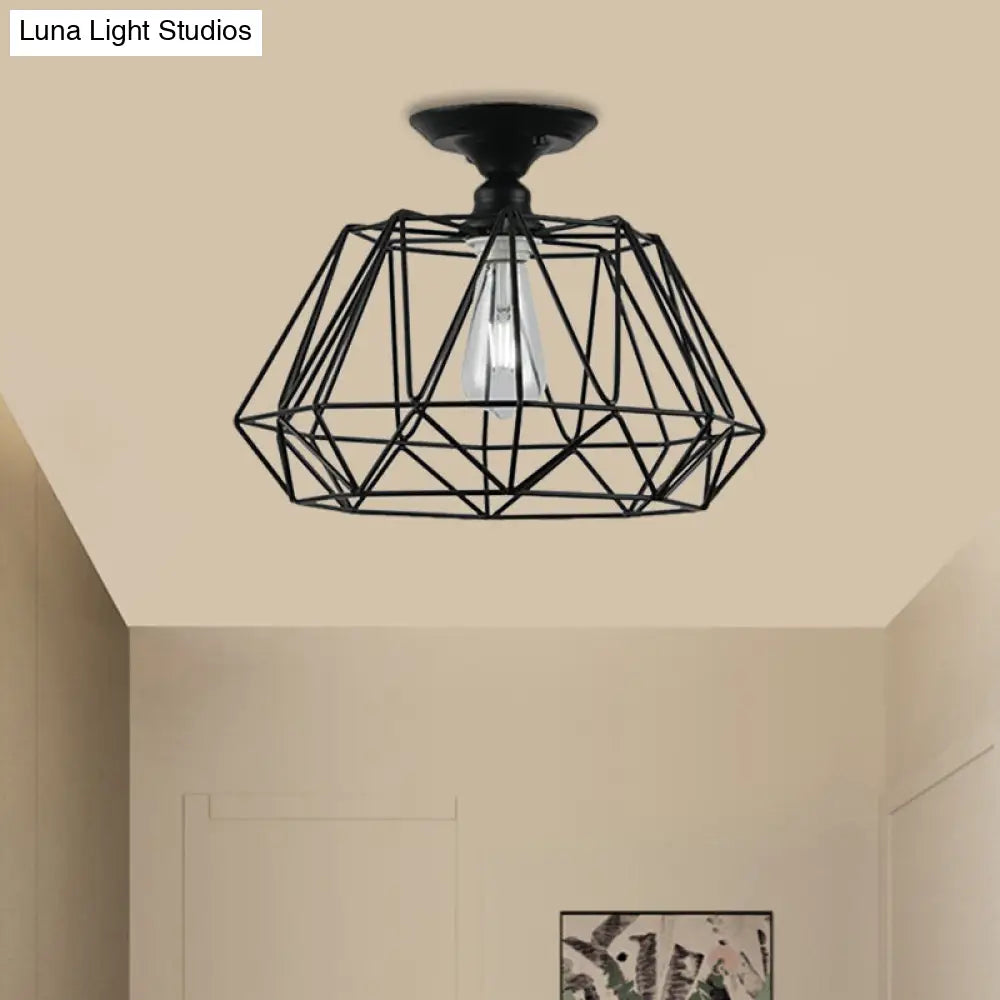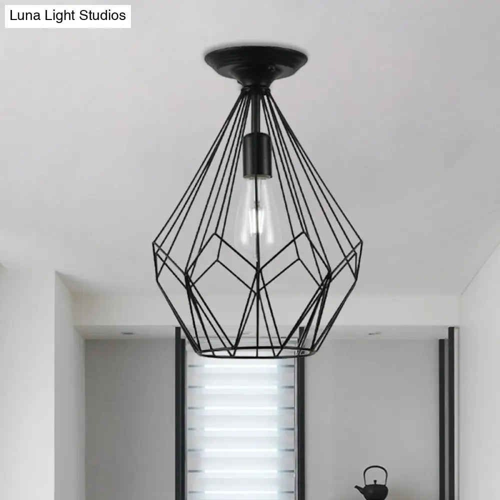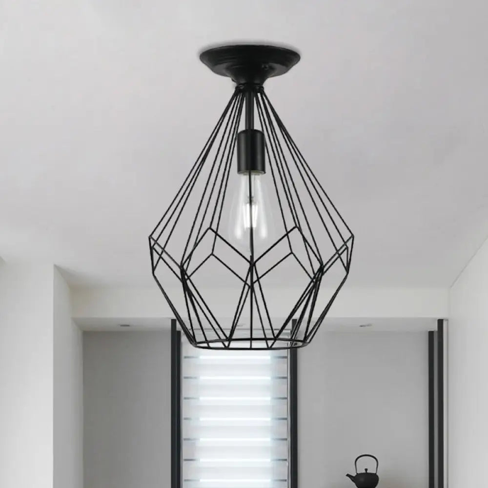 وحدة إضاءة سقف DecorBites™ سوداء معدنية على شكل قفص ماسي للممر - طراز صناعي علوي، قريبة من إضاءة السقف