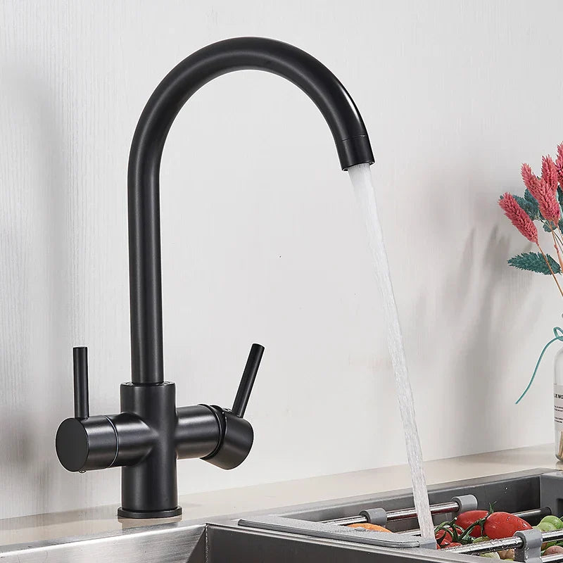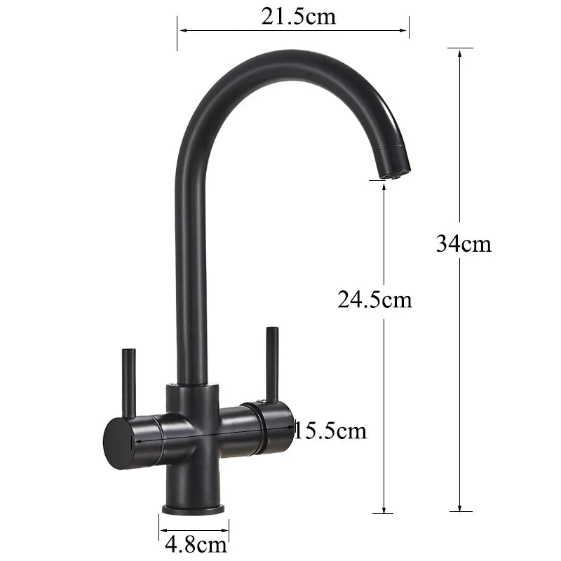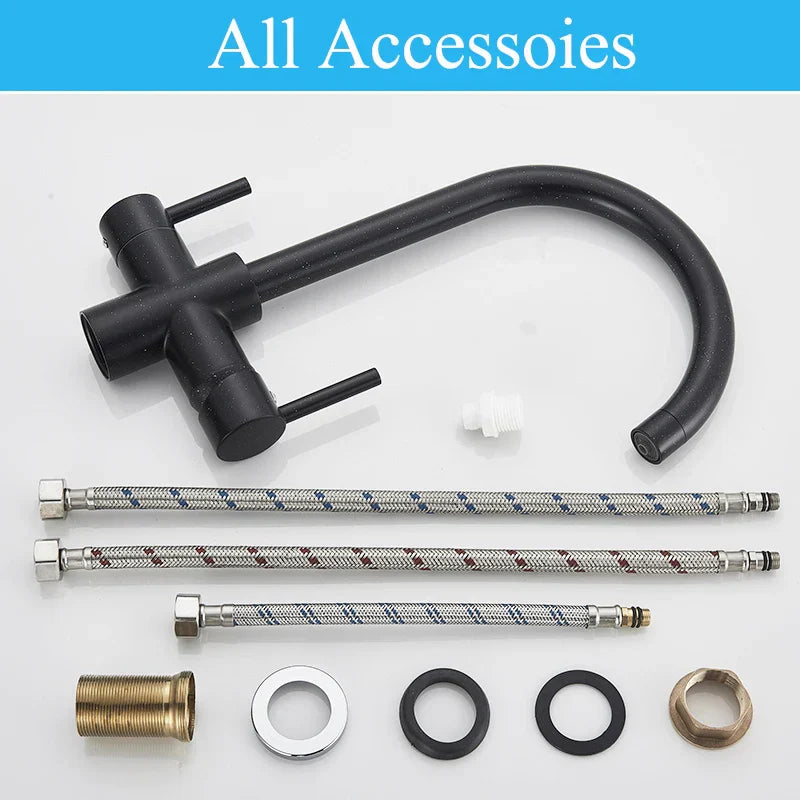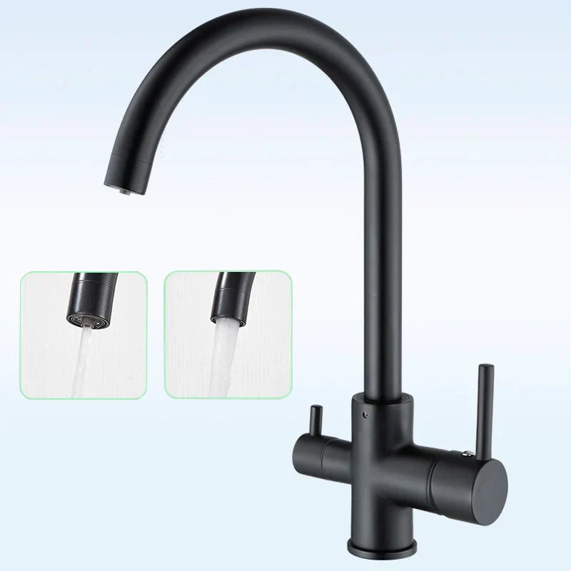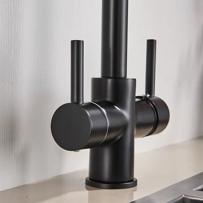 صنبور مطبخ DecorBites™ أسود اللون بمياه نقية، خلاط ساخن وبارد، بمقبضين، صنبور مياه شرب