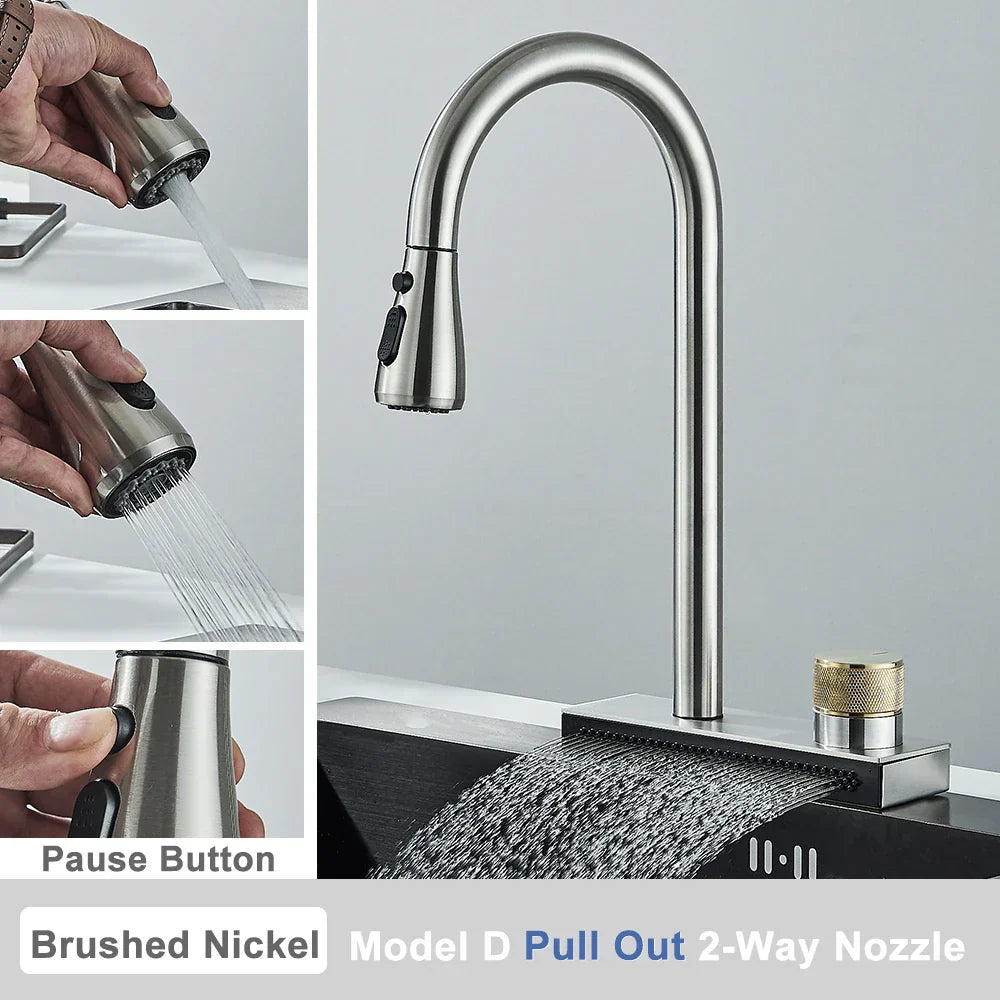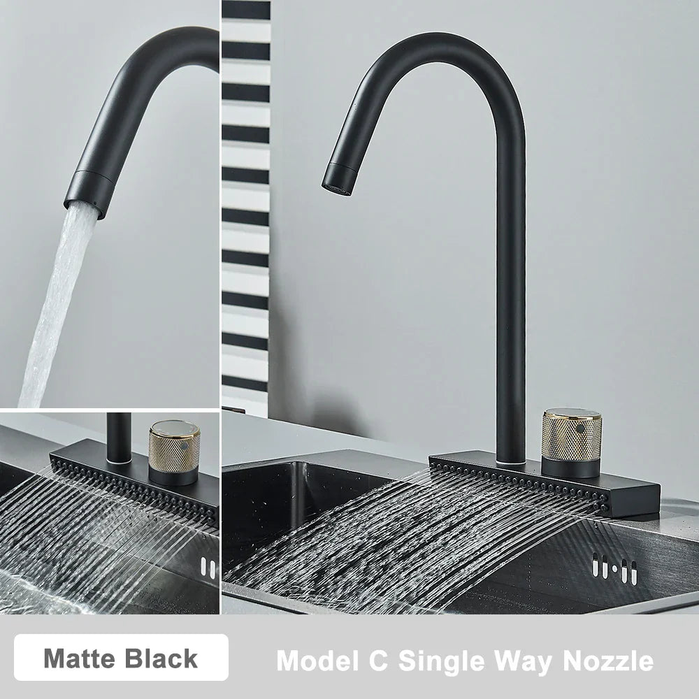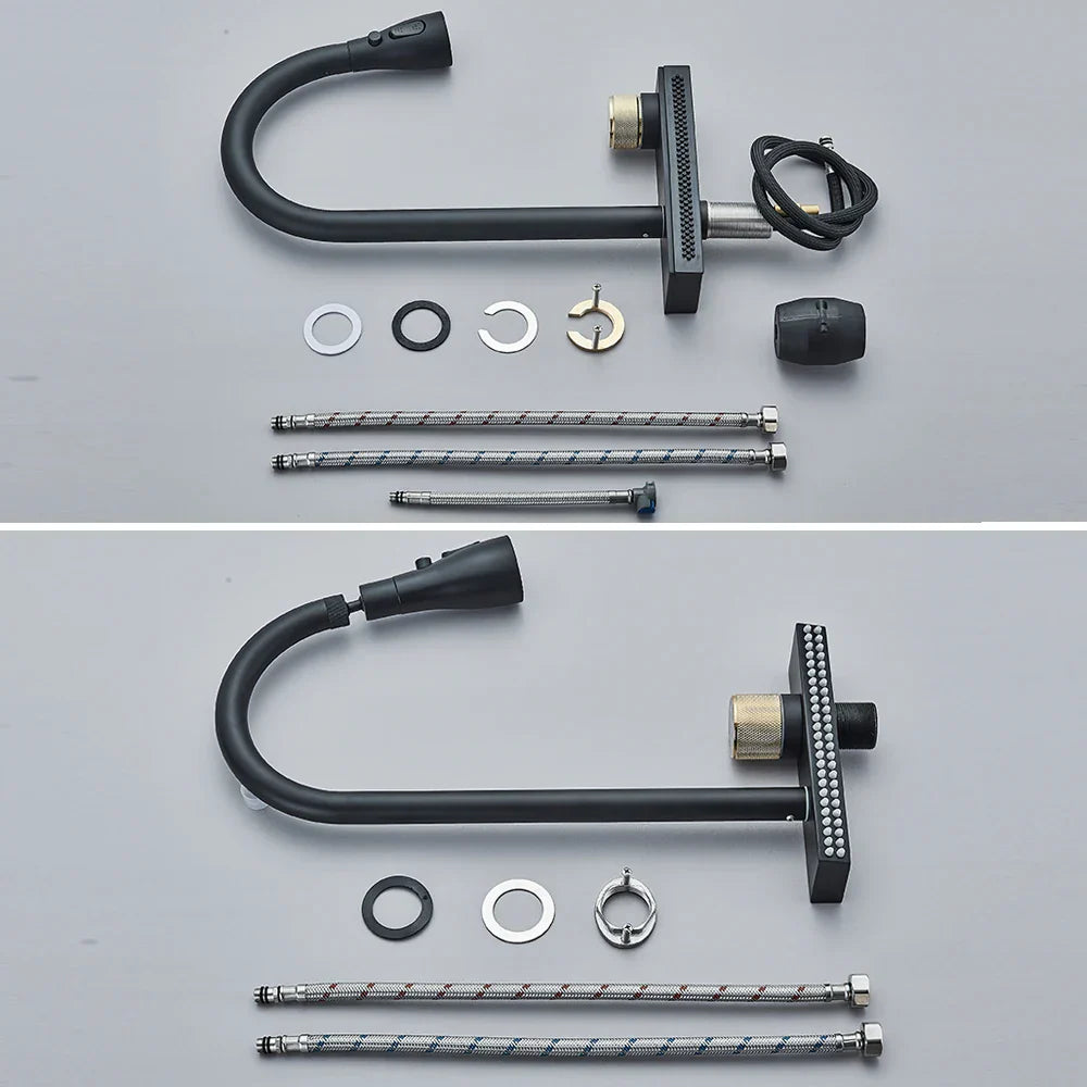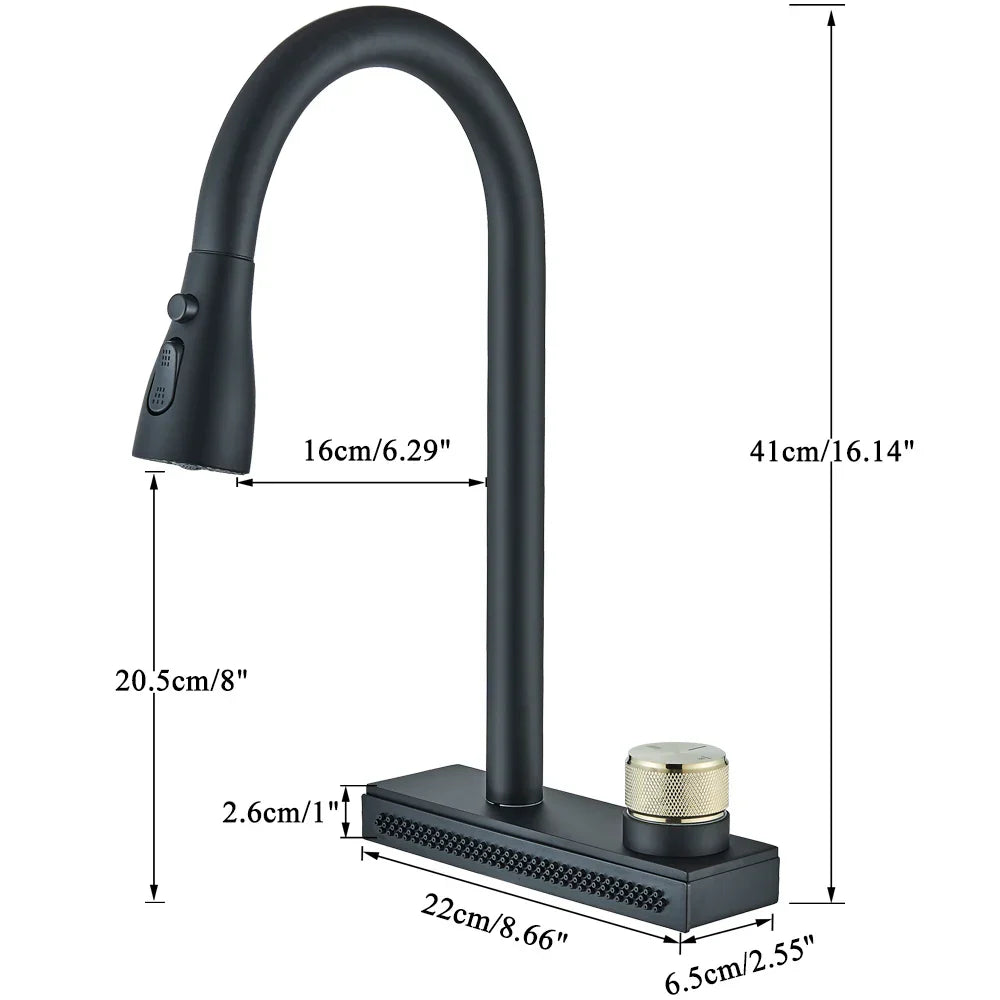يتميز هذا الصنبور بفوهة مرنة ومقبض واحد لسهولة التحكم، ويوفر خيارات الماء البارد والساخن لراحتك. سطحه مطلي بالنحاس بشكل جميل، مما يمنحه مظهرًا أنيقًا خالدًا. بتصميمه العصري وسطحه الأسود غير اللامع، يضفي هذا الصنبور لمسة من الرقي على ديكور أي مطبخ.
