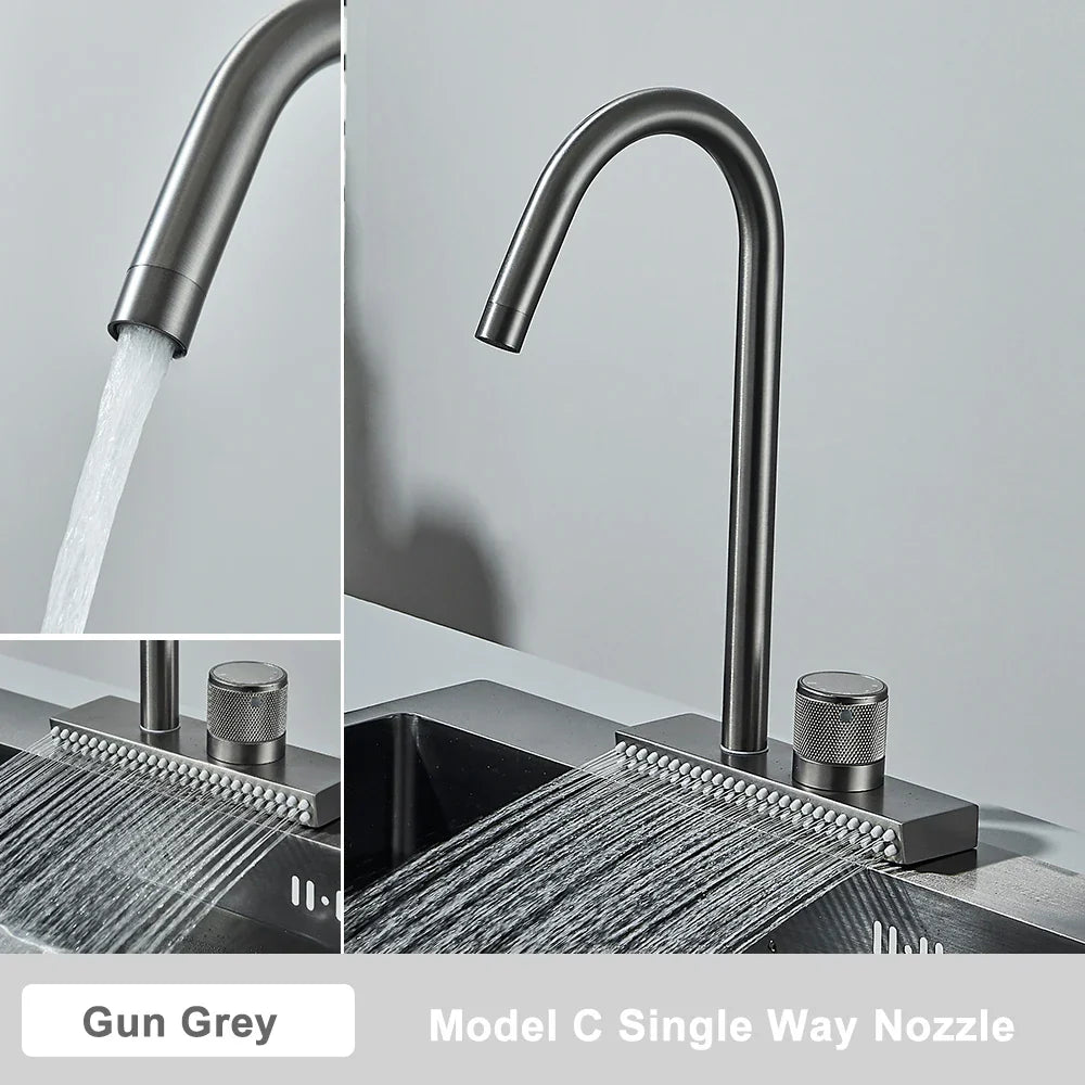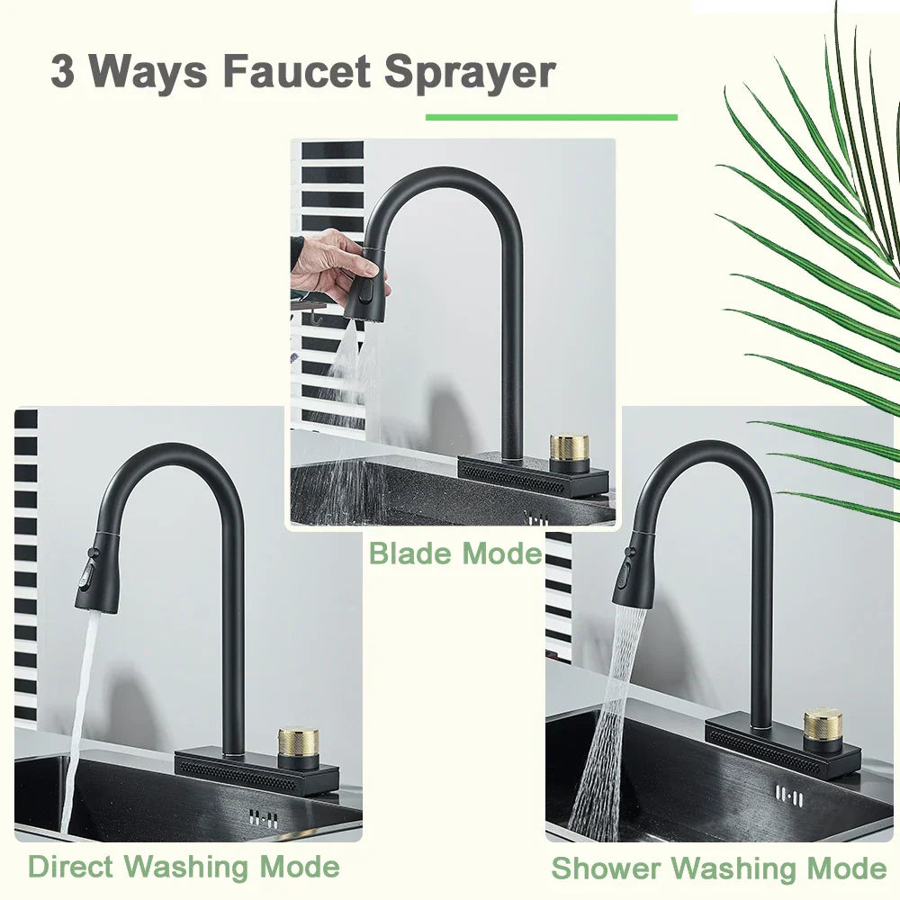 صنبور مطبخ DecorBites™ أسود اللون مقاوم للمياه المطرية، صنبور خلاط مرن بثلاثة اتجاهات قابل للسحب