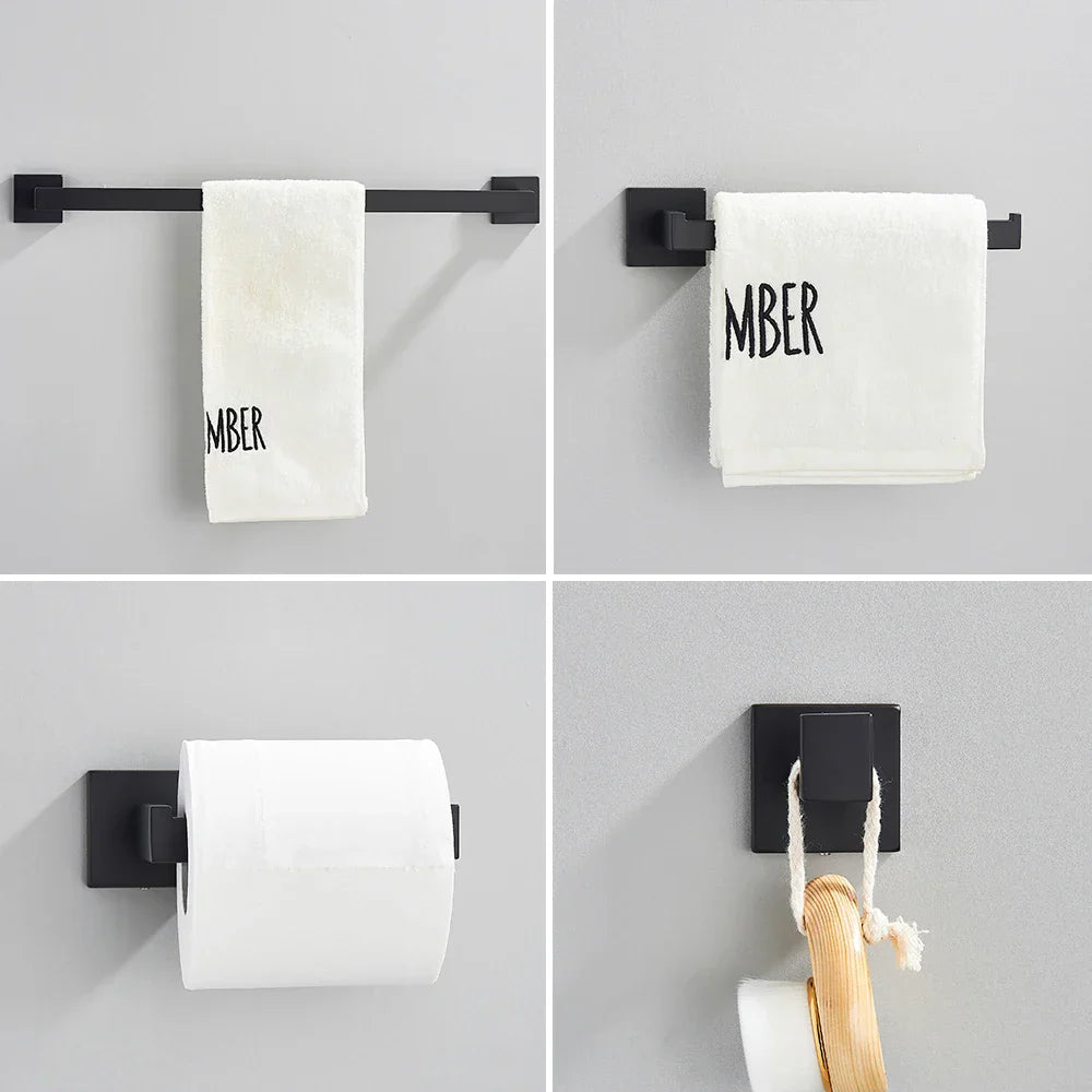 مجموعة إكسسوارات الحمام من DecorBites™ المصنوعة من الفولاذ المقاوم للصدأ باللون الأسود: قضيب مناشف، وحامل ورق، وخطاف، ورف حمام
