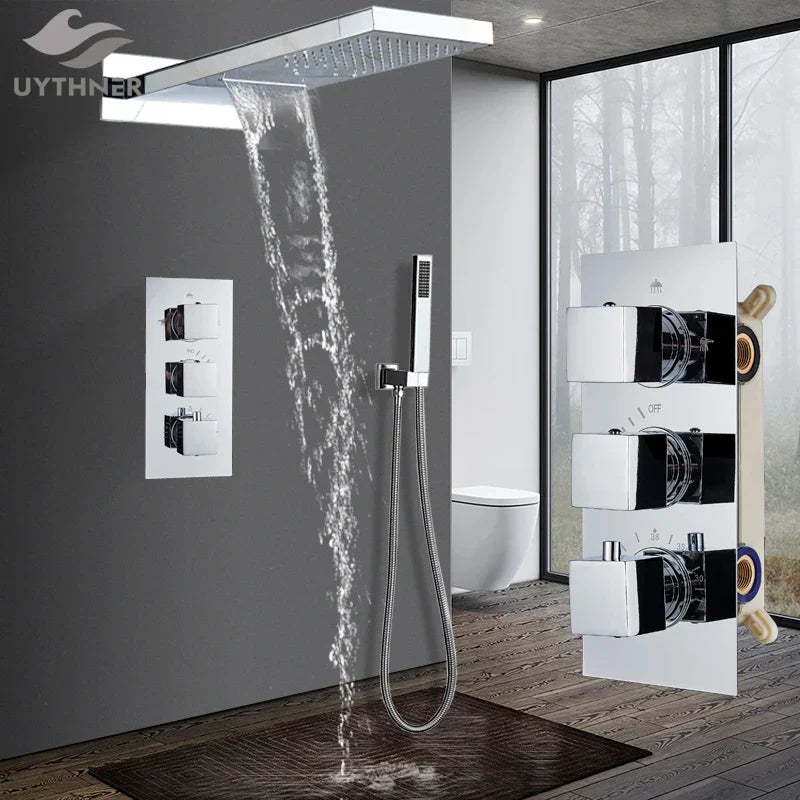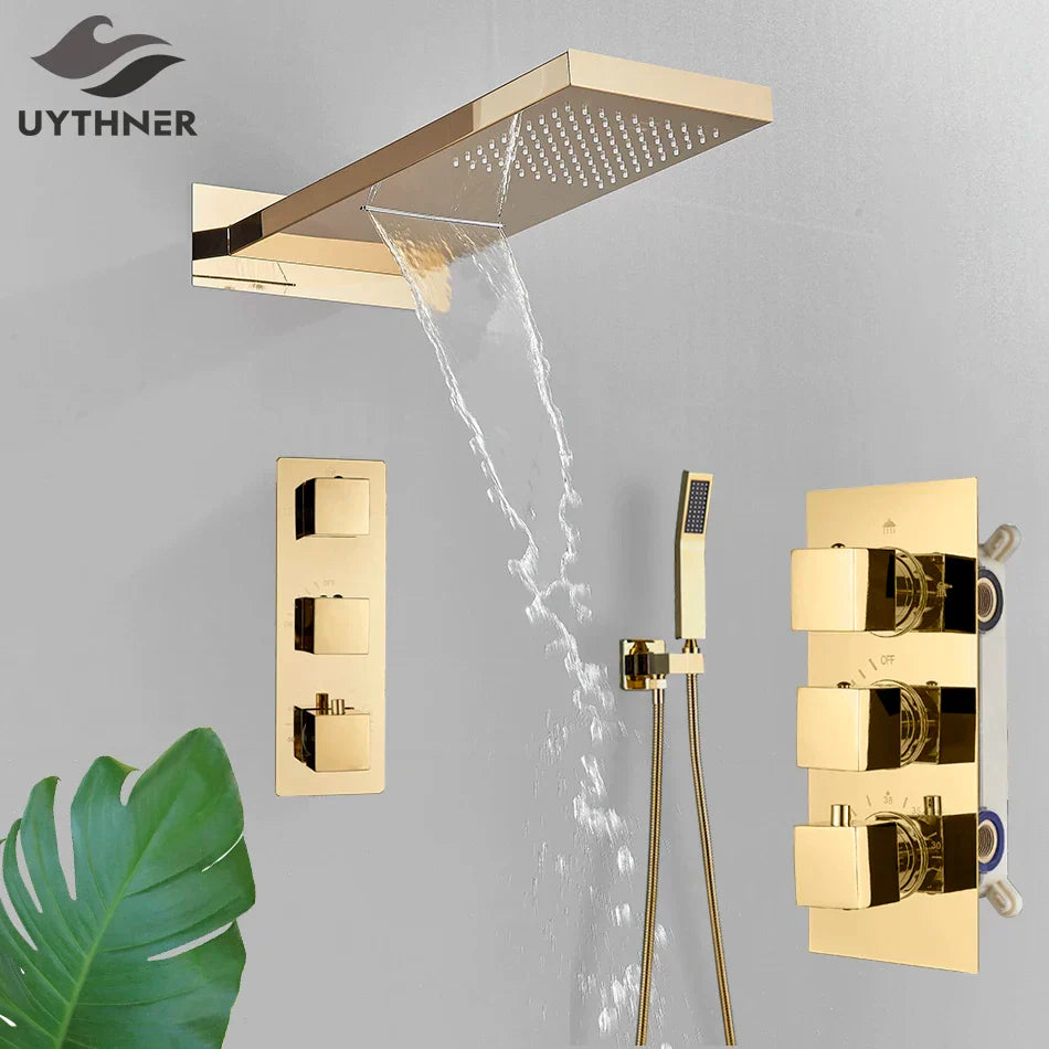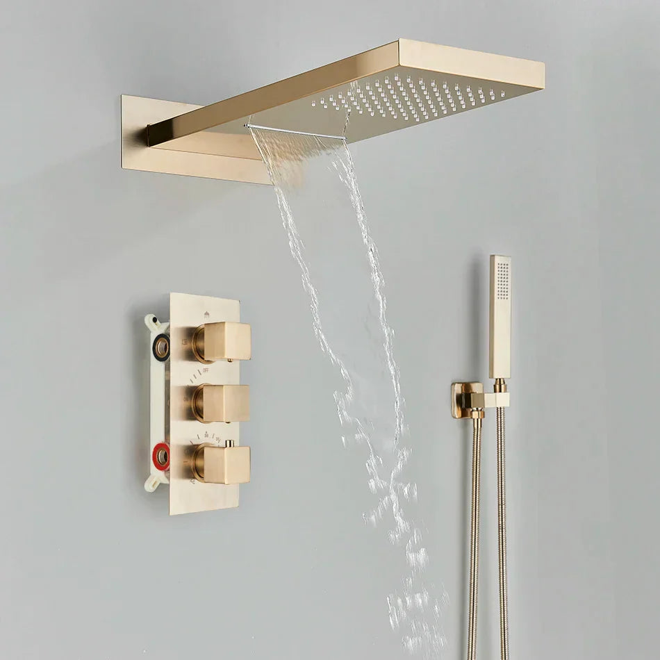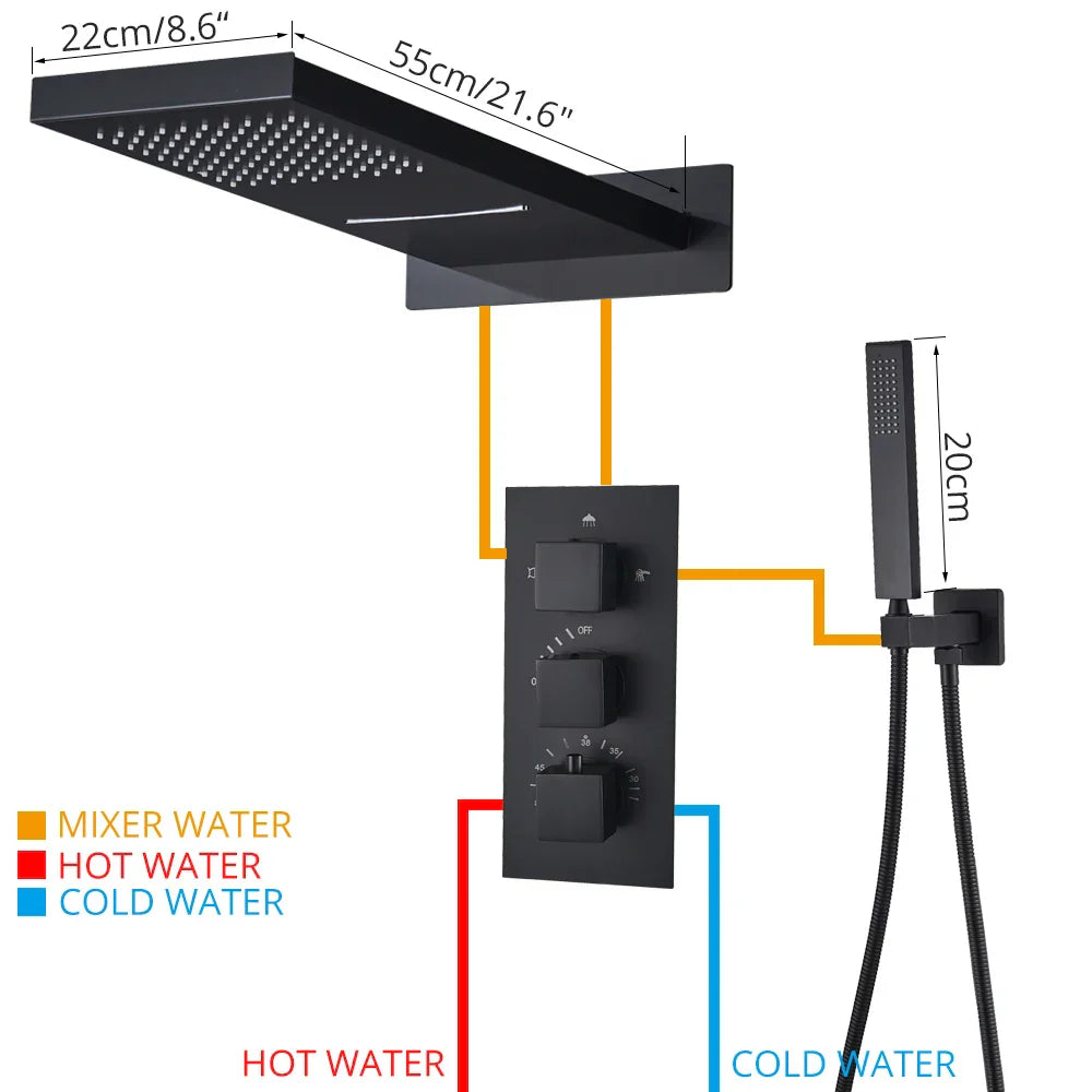 استمتع بسهولة التركيب باستخدام دعامة ثابتة، مثالية للاستخدامات المثبتة على الحائط. رأس الدش النحاسي الكبير الحجم (55*22 سم) يوفر تجربة استحمام فاخرة مع شلال ودش مطري. يضمن الدش اليدوي المصنوع من بلاستيك ABS من الدرجة A الراحة والسهولة أثناء كل استخدام.