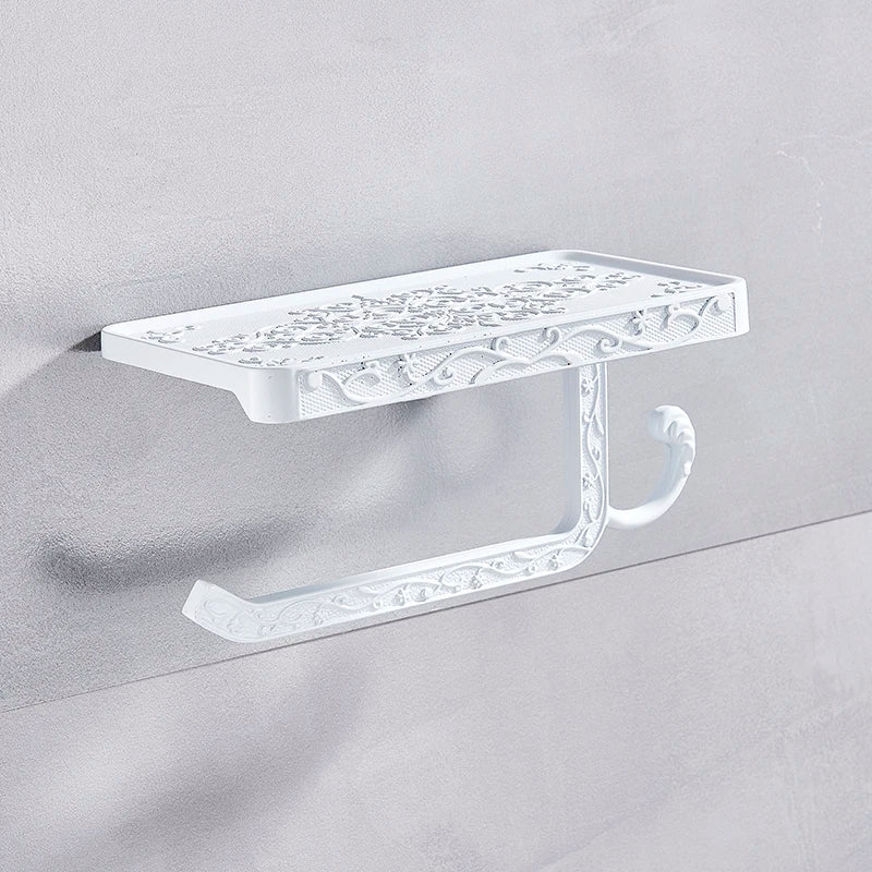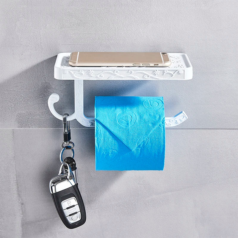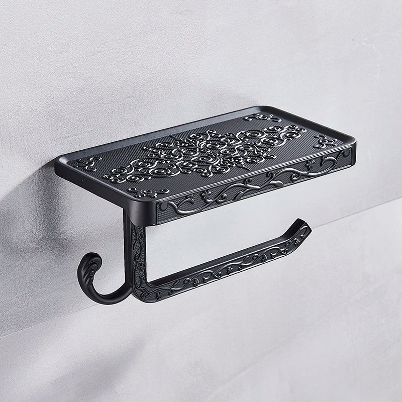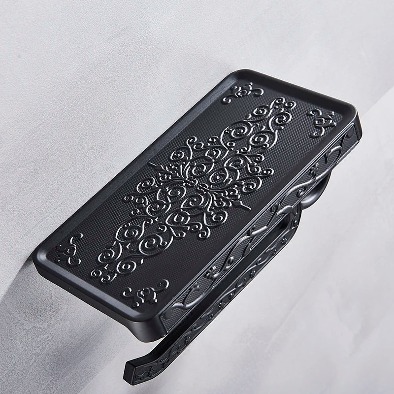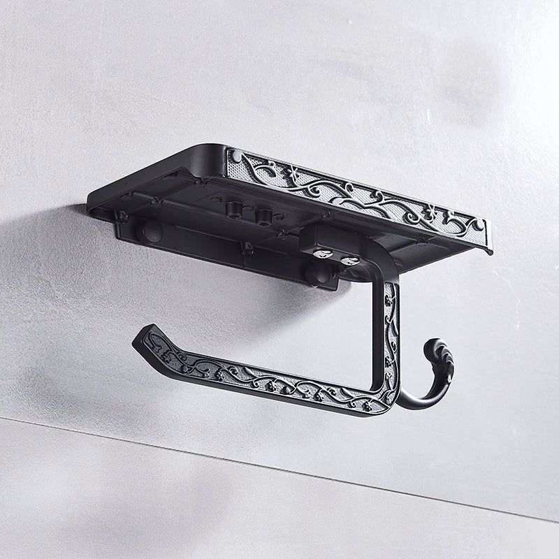 حامل ورق تواليت أسود مع رف للهاتف من DecorBites™: وحدة تخزين حائطية من الألومنيوم للحمام