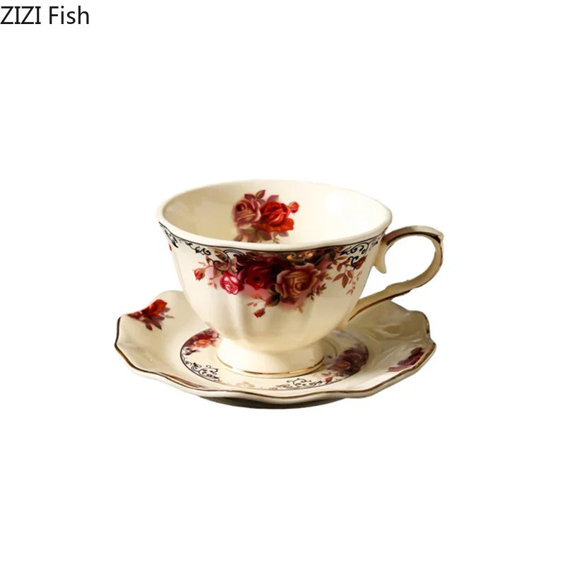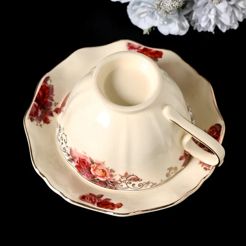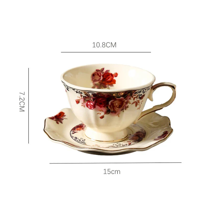 كوب قهوة من البورسلين بتصميم الورود المتفتحة من ديكوربايتس™ مع حافة ذهبية وصحن