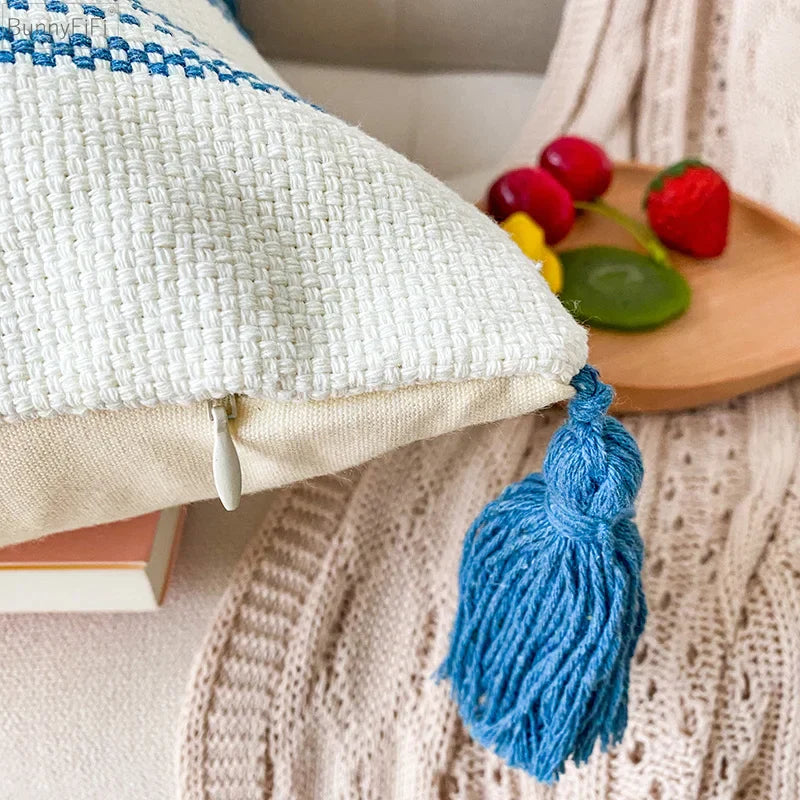 غطاء وسادة DecorBites™ من الجاكار الأزرق الماسي المزخرف بشراشيب مقاس 45×45 سم