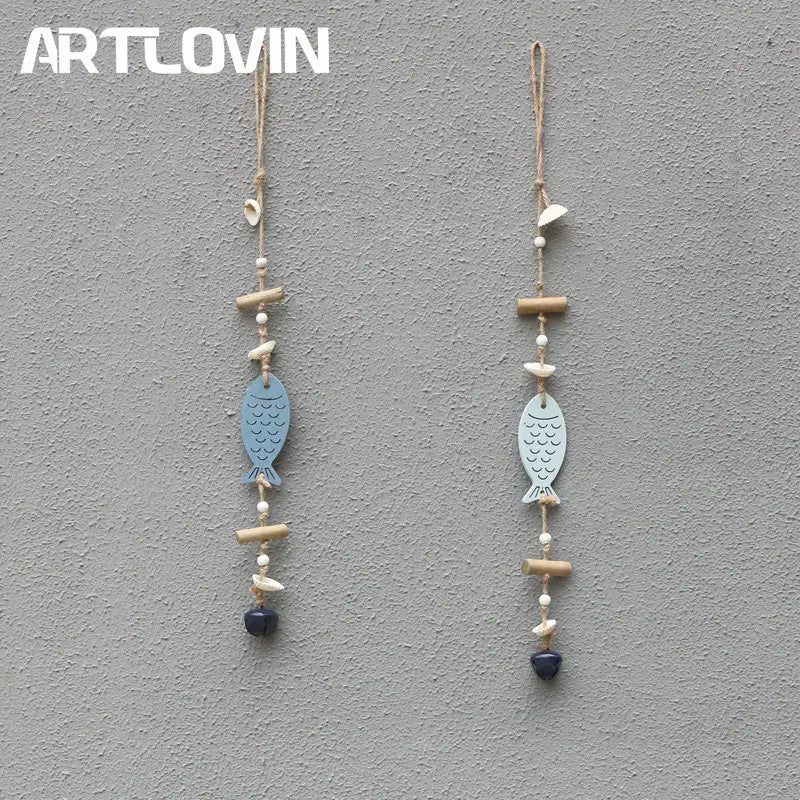ديكور بايتس™ - قلادة على شكل سمكة زرقاء على شكل خادمة بحرية مصنوعة من أجراس خشبية عائمة لتزيين الحائط