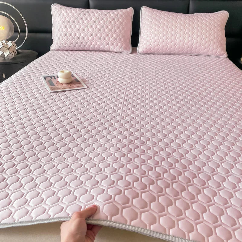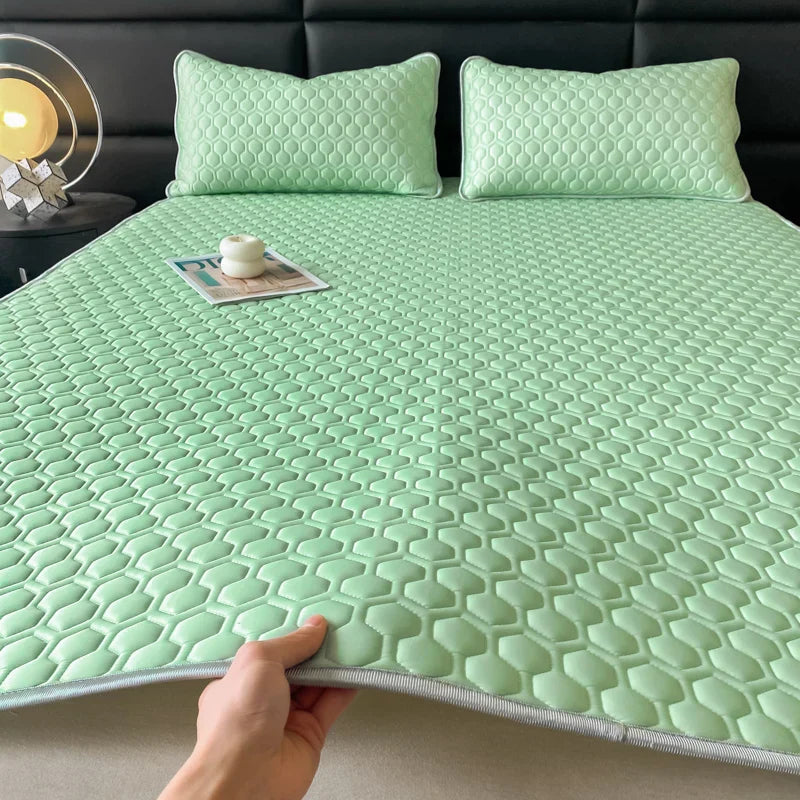 نقدم لكم مجموعة ملاءات السرير المملوءة باللاتكس من Decorbites مع حصيرة التبريد وأغطية الوسائد المصنوعة من الحرير الجليدي، وهي إضافة فاخرة لغرفة نومك توفر راحة لا مثيل لها وخصائص تبريد.