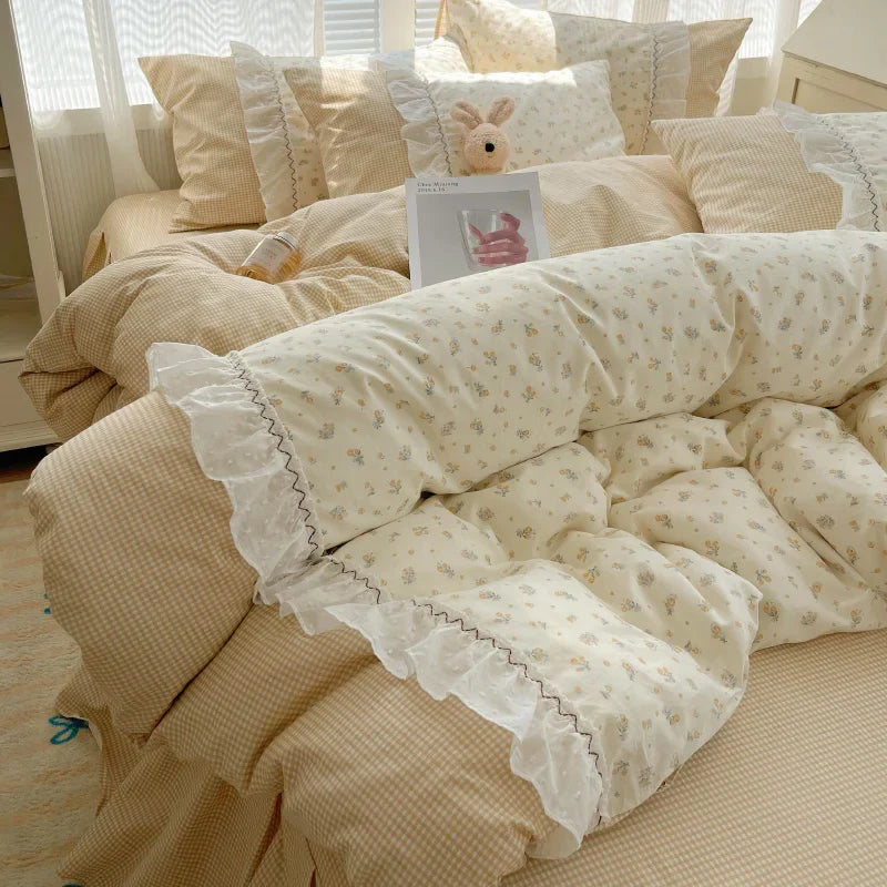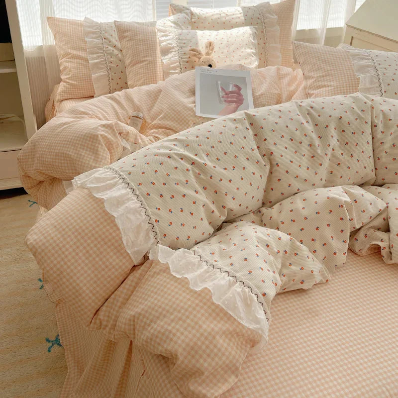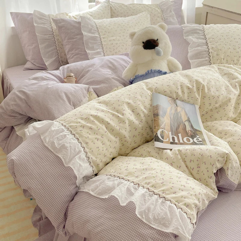 طقم سرير أميرة من القطن بنقشة زهور صغيرة من DecorBites™ - مقاس كوين - غطاء لحاف، ملاءة سرير، تنورة سرير، أغطية وسائد