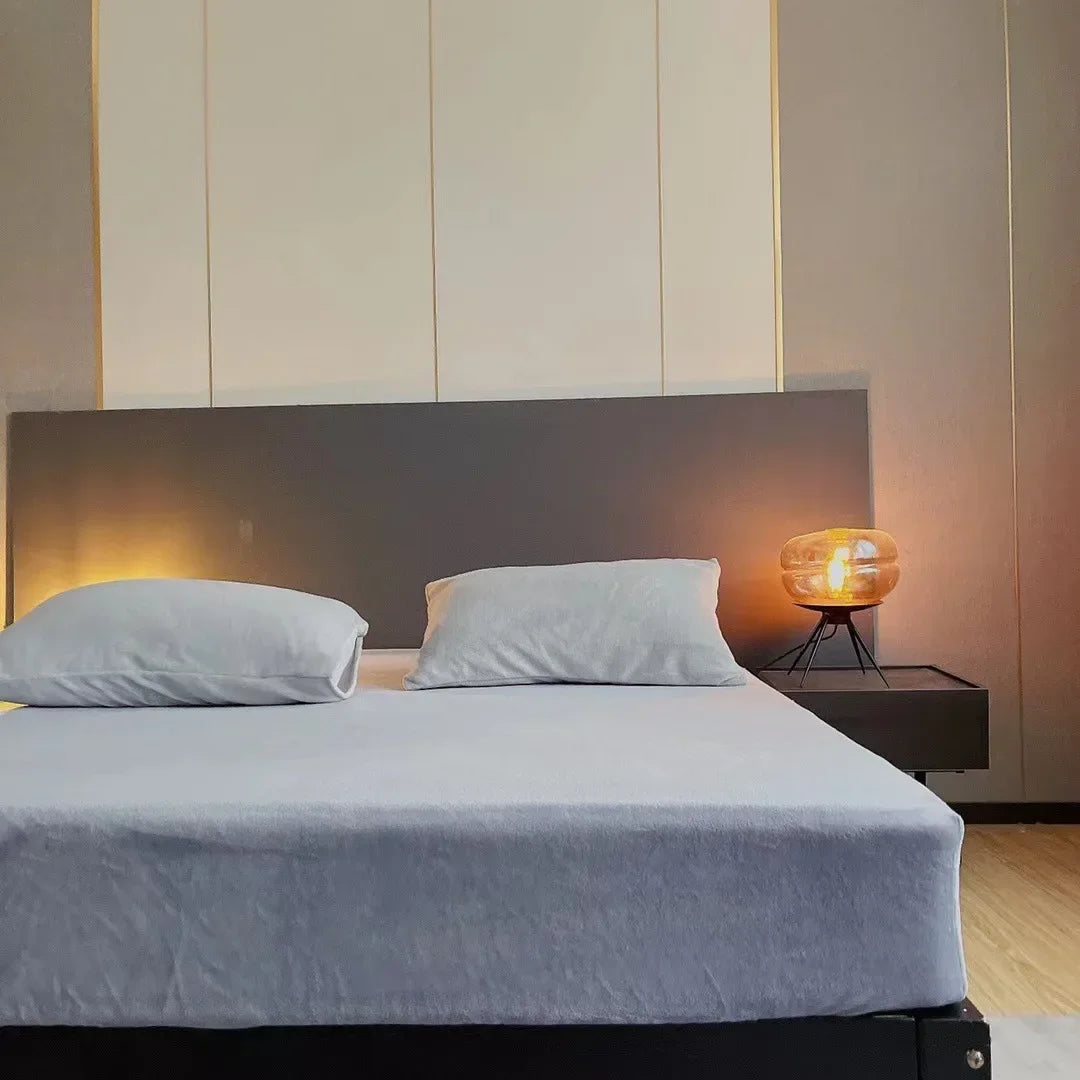 ملاءة سريرنا عالية الجودة مصممة بعدد 50 قماشًا و500 خيط، مما يضمن ملمسًا ناعمًا ومتينًا يدوم لسنوات. يتراوح وزن الملاءة بين 0.5 و1 كجم، مما يجعلها خفيفة الوزن ومريحة لنوم هانئ.