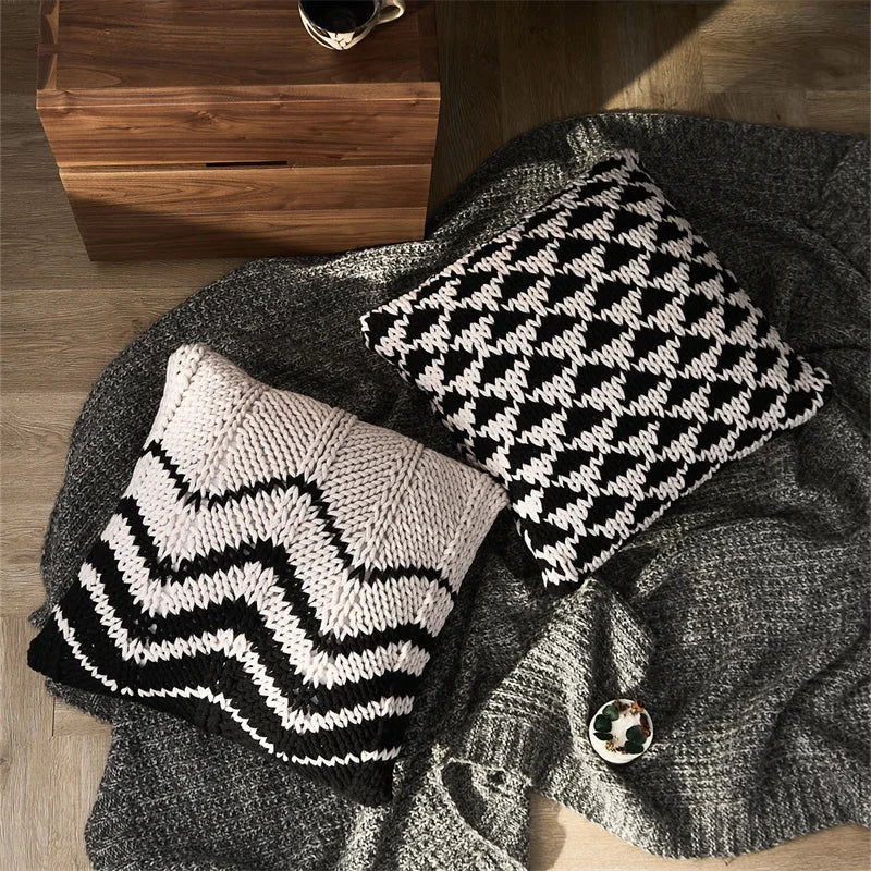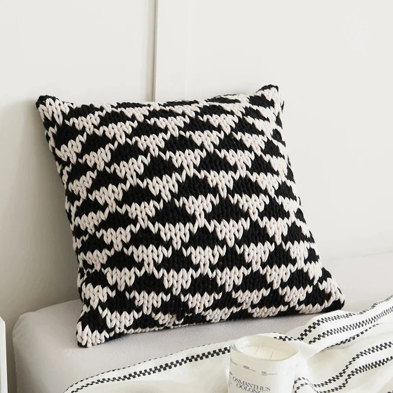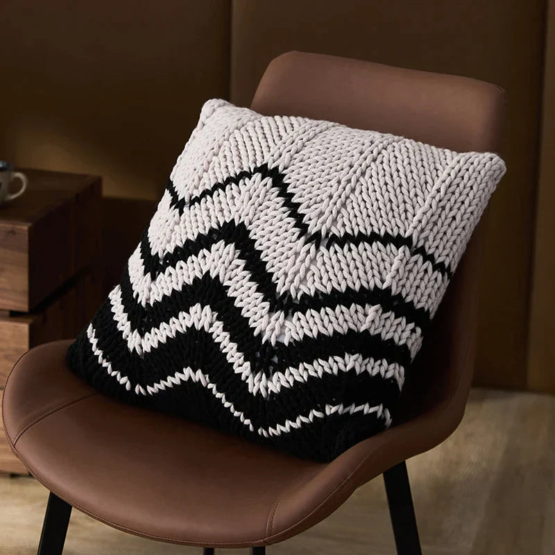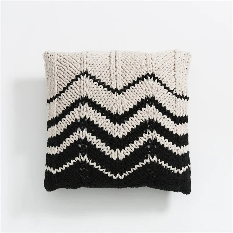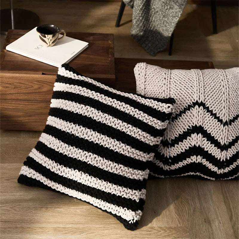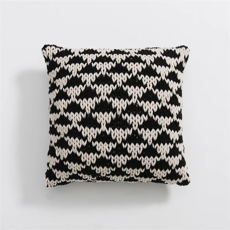 نقدم لكم وسادة ديكوربيتس المربعة المنسوجة بنقشة هندسية جيو نيت المخططة، إضافة عصرية وأنيقة لديكور منزلك. تتميز هذه الوسادة بنقش هندسي أنيق باللونين الأسود والعاجي، مما يضفي لمسة من الرقي على أي غرفة.