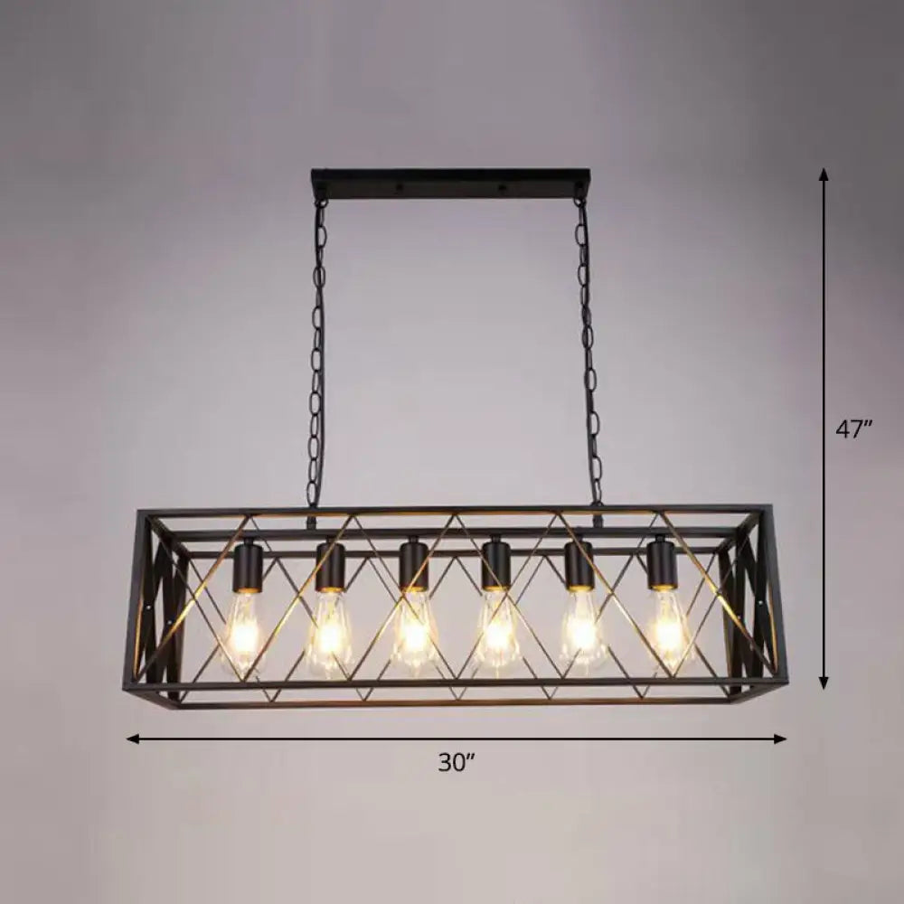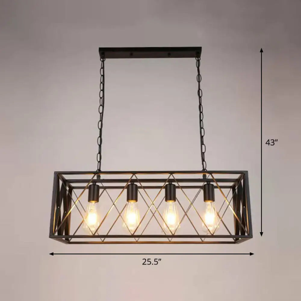 هذا المنتج مصباح معلق على شكل صندوق، مثالي للتعليق فوق جزيرة في غرفة الطعام. مصنوع من معدن أسود بتصميم إطار متقاطع. يأتي مع غطاء معدني أسود مستطيل الشكل. يتسع لـ 4-6 مصابيح، وهو متوافق مع مصابيح LED والمصابيح المتوهجة والفلورسنت. جهده 110-120 فولت، ويأتي مع سلسلة للتركيب.