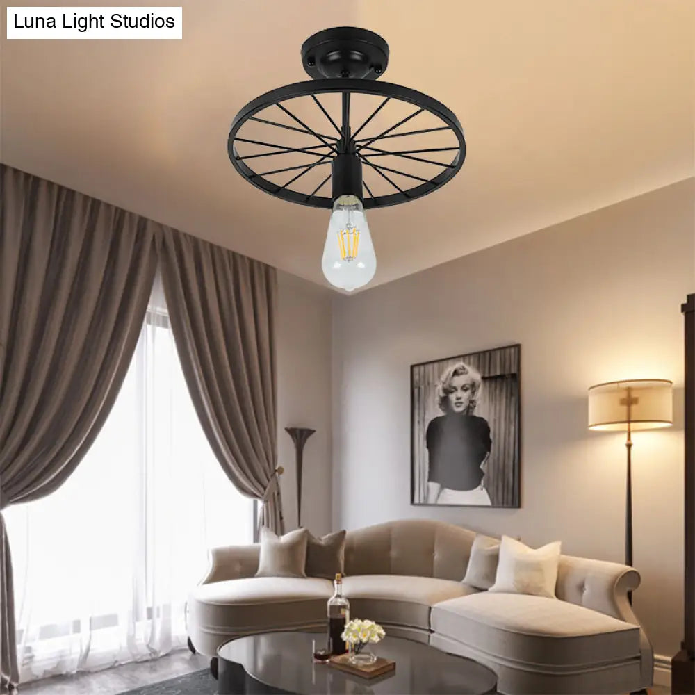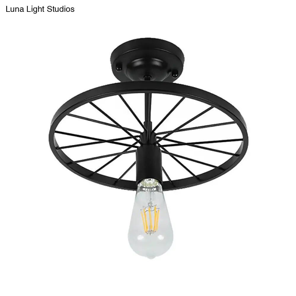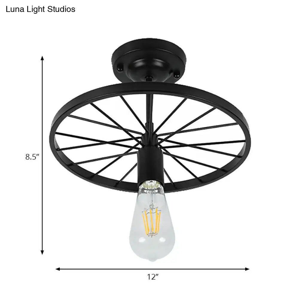 هذا مصباح شبه مُسطّح بلمسة نهائية سوداء، مصنوع من المعدن ومزخرف بعجلات. يتميز بتصميم صناعي، ويحتوي على مصباح واحد. المصباح من نوع LED، أو متوهج، أو فلورسنت، بقاعدة E26/E27. أبعاده من 10 إلى 14 بوصة، وعرضه 12 بوصة، وارتفاعه 8.5 بوصة. جهده 220-240 فولت أو 110-120 فولت.