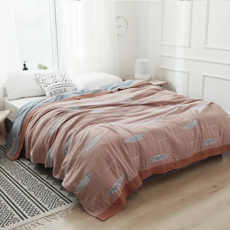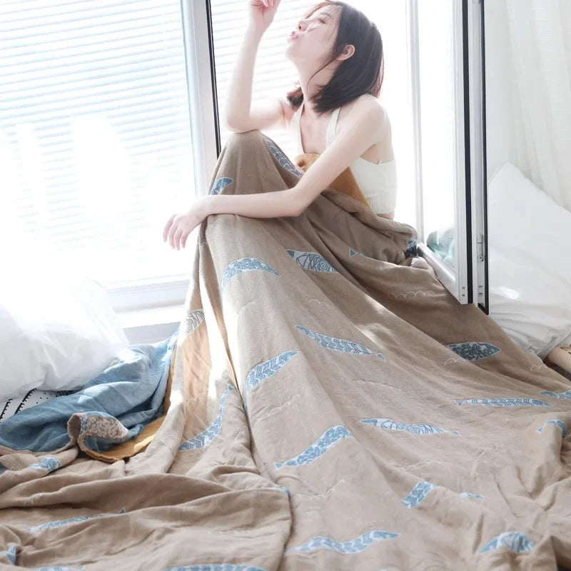 ارتقِ بتجربة الاسترخاء مع بطانية الشاش القطنية بنقشة سمكة كاواي. استمتع بالراحة والأناقة والعملية مع هذه القطعة متعددة الاستخدامات.