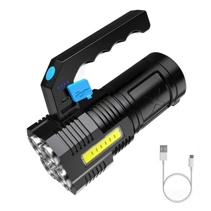 نقدم لكم مصباح LED، رفيقكم المثالي في الهواء الطلق، الذي يضيء ببراعة بفضل 4 حبات مصباح عالية الجودة وكشاف COB. صُمم هذا المصباح اليدوي القابل لإعادة الشحن عبر USB لإضاءة جميع مغامراتكم بسهولة.