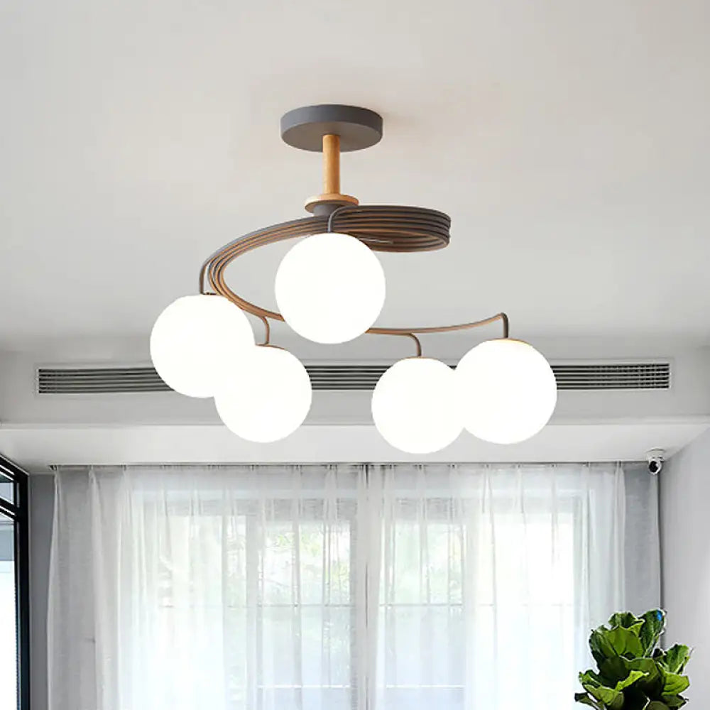 ثريا DecorBites™ Nordic Iron Swirl Flush مع 5 لمبات، ومصباح سقف شبه مسطح رمادي/أخضر مع غطاء زجاجي دائري وقضيب خشبي للأسفل