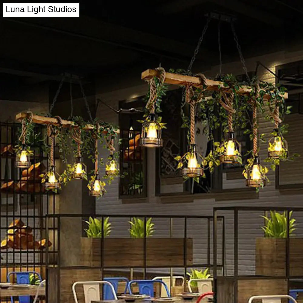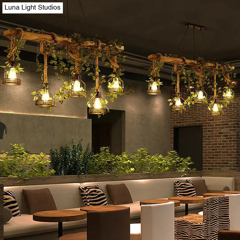 ديكوربايتس™ مصباح جزيرة بني خشبي ريفي مع 5 رؤوس، وغطاء قفص، وقلادة فنية خضراء من اللبلاب