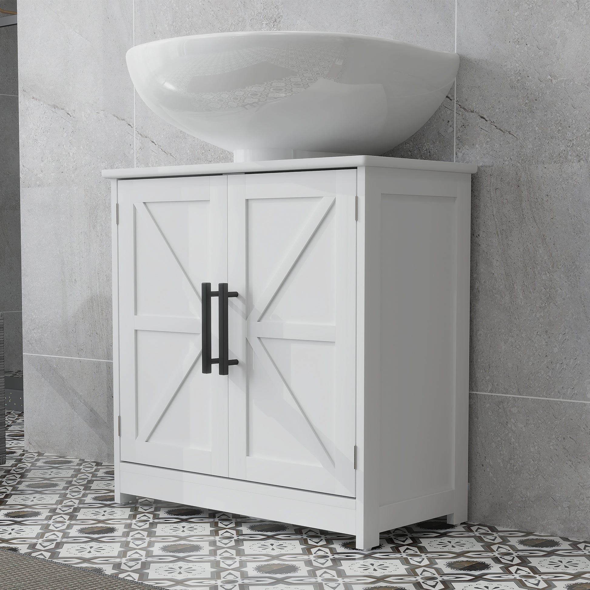 Transform your bathroom with the HOMCOM pedestal sink cabinet, blending farmhouse charm with practical design. Featuring stylish barn doors and sleek black metal handles, this cabinet for the bathroom offers an adjustable shelf for customizable storage. Its compact, space-saving build with a pre-cut U-shaped slot is great for snug spaces, adding a touch of rustic elegance to any small bathroom.