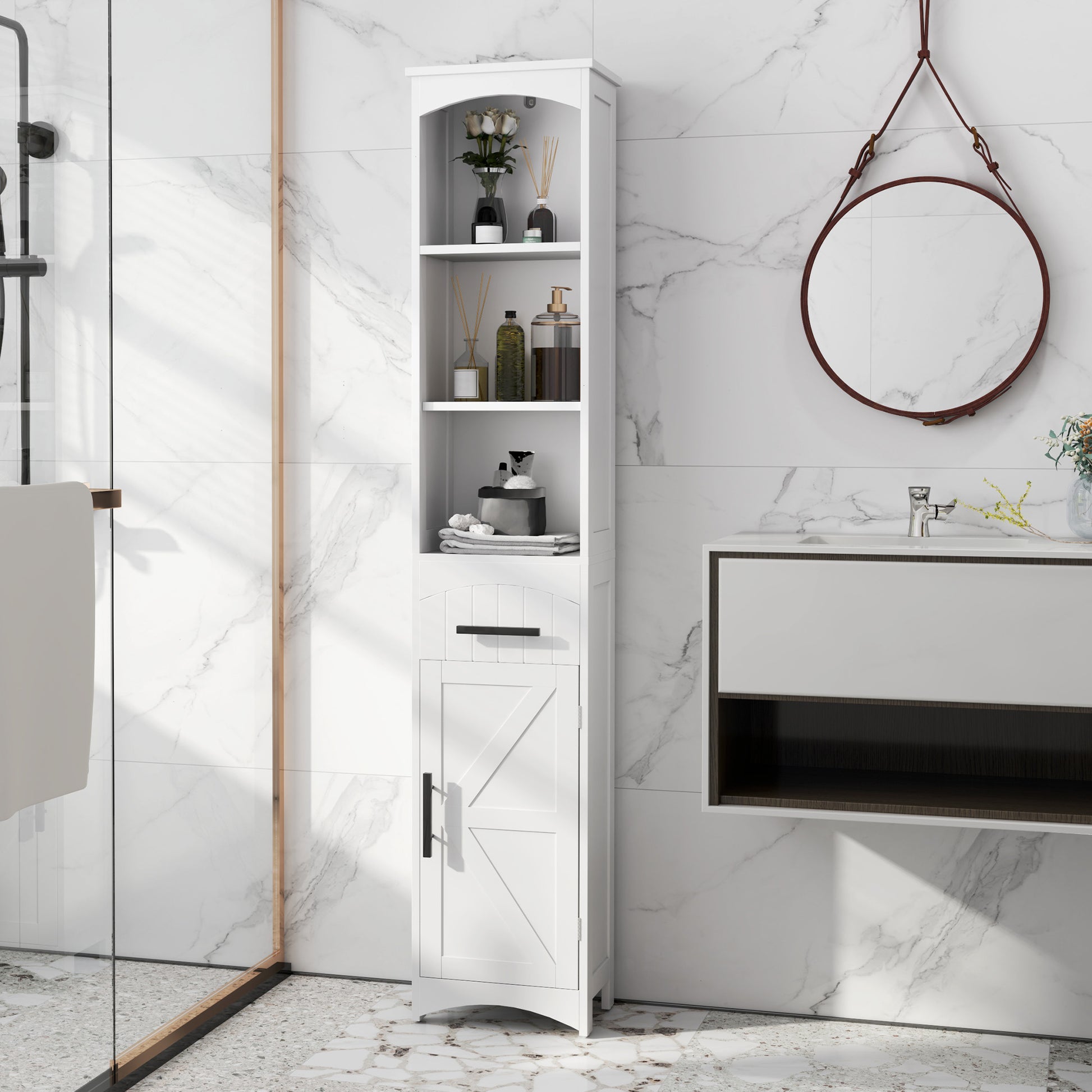 Farmhouse Tall Slim Bathroom Storage Cabinet with Recessed Drawer