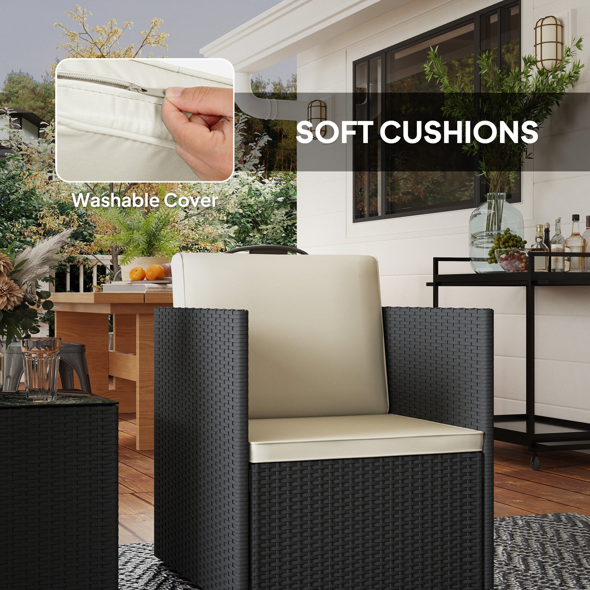 Elevate your outdoor lounging with the Outsunny porch furniture set. This chic set includes two garden chairs with comfortably padded cushions and a sleek coffee table, all crafted from weather-resistant PE rattan wicker on a solid steel frame. It's a great addition to any small patio, balcony, or porch, blending functionality with style to enhance any outdoor space. Features: - Folding garden chairs and coffee table for an easy-setup bistro set - Foldable design, space-saving and easy to store when not in use - Steel frame with PE rattan wicker for long-term outdoor use - Padded cushions with washable covers provide comfortable seating - Tempered glass tabletop offers sleek surface for coffee and other drinks - Adjustable foot pads protect floors and enhance stability - Easy to assemble in 10 minutes without tools or screws Specification: - Color: Black, White - Material: PE Rattan, Steel, Polyester, Tempered Glass - Chair Dimension: 25.2" W x 24.8" D x 26" H - Table Dimension: 16.9" W x 16.9" D x 18.1" H - Glass Top Size: 22.8" L x 23.6" W X 0.2" D - Seat Size: 22.8" W x 23.6" D x 13" H - Back Size: 22.8" W x 13" H - Back Cushion Size: 22.8" L x 15.7" W - Seat Cushion Size: 22.8" L x 23.6" W x 2" D - Weight Capacity: 353 lbs. (Chair), 110 lbs. (Table) - Item Label: 863-162V00BK Package Includes: - 1 x Table - 2 x Chairs - 2 x Seat Cushion - 2 x Back Cushion - 1 x Manual Elevate your outdoor lounging with the Outsunny porch furniture set. Features: - Folding garden chairs and coffee table for an easy-setup bistro set - Foldable design, space-saving and easy to store when not in use - Steel frame with PE rattan wicker for long-term outdoor use - Padded cushions with washable covers provide comfortable seating - Tempered glass tabletop offers sleek surface for coffee and other drinks - Adjustable foot pads protect floors and enhance stability - Easy to assemble in 10 minutes without tools or screws Specification: - Color: Brown, Black, Cream White - Material: PE Rattan, Steel, Polyester, Tempered Glass - Chair Dimension: 25.2" W x 24.8" D x 26" H - Table Dimension: 16.9" W x 16.9" D x 18.1" H - Glass Top Size: 22.8" L x 23.6" W X 0.2" D - Seat Size: 22.8" W x 23.6" D x 13" H - Back Size: 22.8" W x 13" H - Back Cushion Size: 22.8" L x 15.7" W - Seat Cushion Size: 22.8" L x 23.6" W x 2" D - Weight Capacity: 353 lbs. (Table) - Item Label: 863-162V00BN Package Includes: - 1 x Table - 2 x Chairs - 2 x Seat Cushion - 2 x Back Cushion - 1 x Manual.
