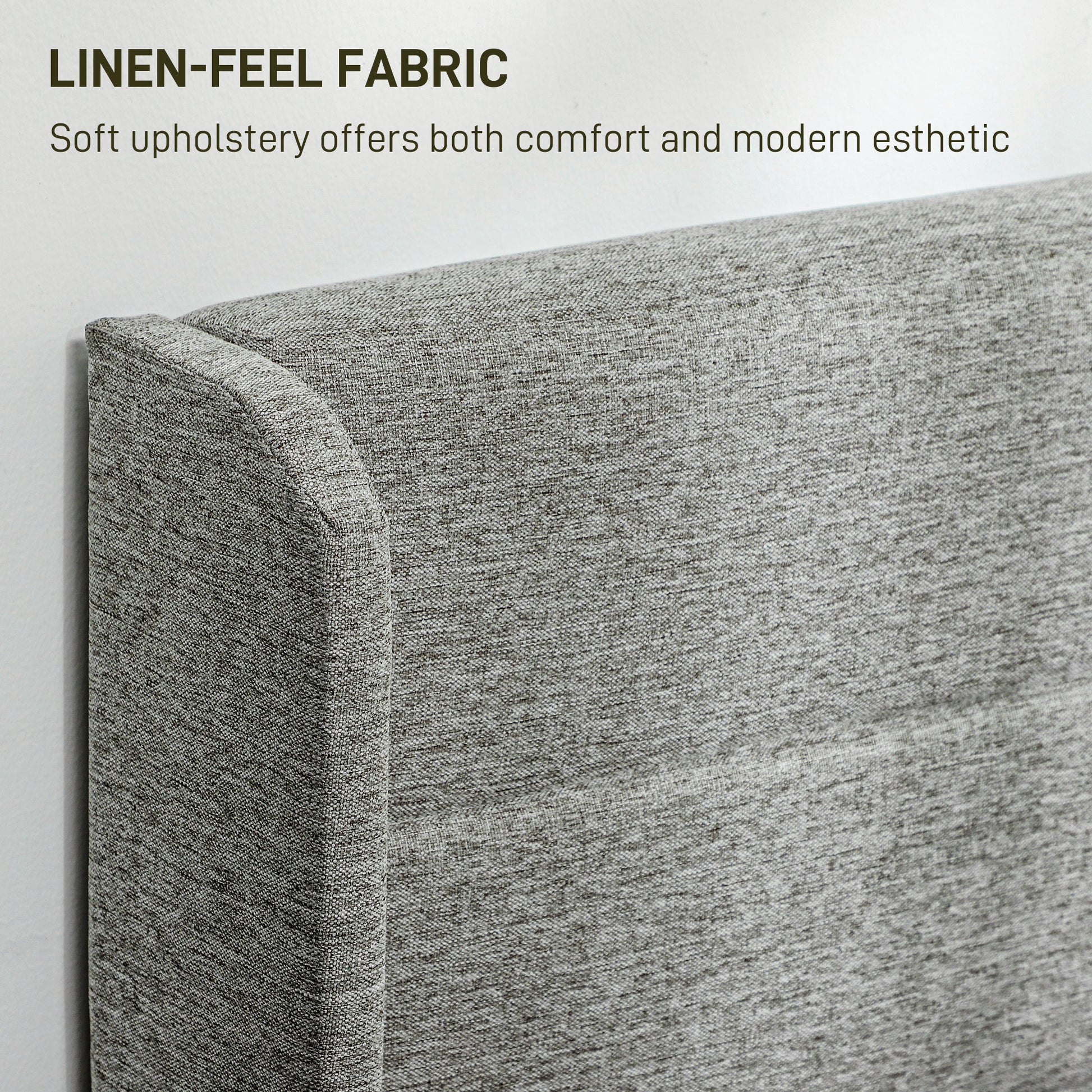 Transform your bedroom with the HOMCOM full bed frame with storage where style meets functionality. This full size platform bed frame offers comfort. It's wrapped in chic linen-feel fabric. It features four spacious drawers on wheels to tuck away your essentials. It's supported by a strong steel frame with wood slats and legs. Enjoy a clutter-free sanctuary with this upholstered bed frame from HOMCOM. Features: - Linen-feel fabric upholstery ensures comfort and style - Four drawers on wheels - The powder-coated steel frame has ten wood slats and six legs - It supports up to 730 lbs. - EVA mats included to prevent noise - Easy to assemble, no box spring needed Specification: - Color: Light Gray - Materials: Steel, Multilayer Board, Linen (100% Polyester), Foam - Overall Dimensions: 57.1" W x 78.3" D x 41.3" H - Suitable Mattress Size: 53.9" W x 74.8" H (Full Size) - Headboard Size: 54.7" W x 5.9" D x 41.3" H - Footboard Size: 54.7" W x 2" D x 10.8" H - Drawer Inner Size: 28.7" W x 19.7" D x 4.3" H - Weight Capacity: 730 lbs. - Item Label: 831-814V80CW Package Includes: - 1 x Bed Frame - 1 x Manual Transform your bedroom with the HOMCOM queen bed frame with storage where style meets functionality. This queen platform bed frame offers comfort. - EVA mats included to prevent noise - Easy to assemble, no box spring needed Specification: - Color: Light Gray - Materials: Steel, Multilayer Board, Linen (100% Polyester), Foam - Overall Dimensions: 63" W x 83.5" D x 41.3" H - Suitable Mattress Size: 60.2" W x 79.9" H (Queen Size) - Headboard Size: 61" W x 5.9" D x 41.3" H - Footboard Size: 62.2" W x 2" D x 10.8" H - Drawer Inner Size: 28.7" W x 19.7" D x 4.3" H - Weight Capacity: 730 lbs. - Item Label: 831-814V81CW Package Includes: - 1 x Bed Frame - 1 x Manual.