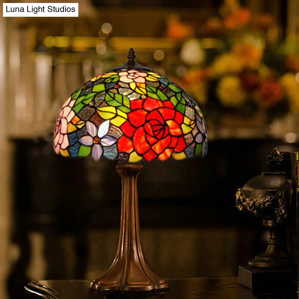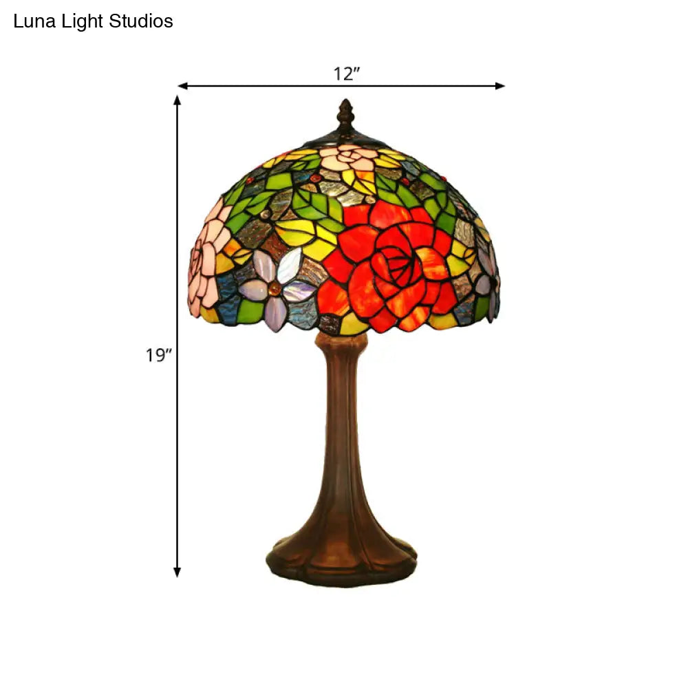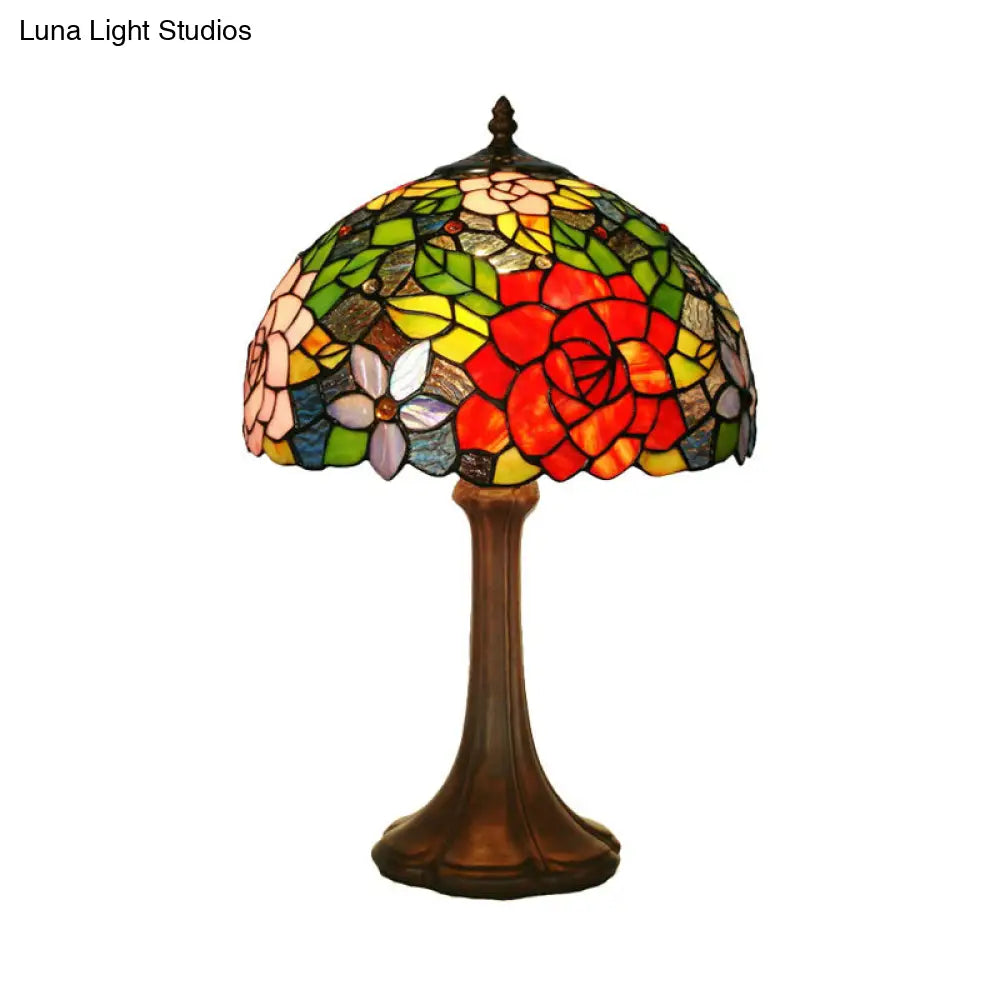 أريا - مصباح طاولة وردي من الزجاج الملون المقطوع يدويًا على الطراز الفيكتوري، مصباح طاولة ليلي برونزي برأس واحد