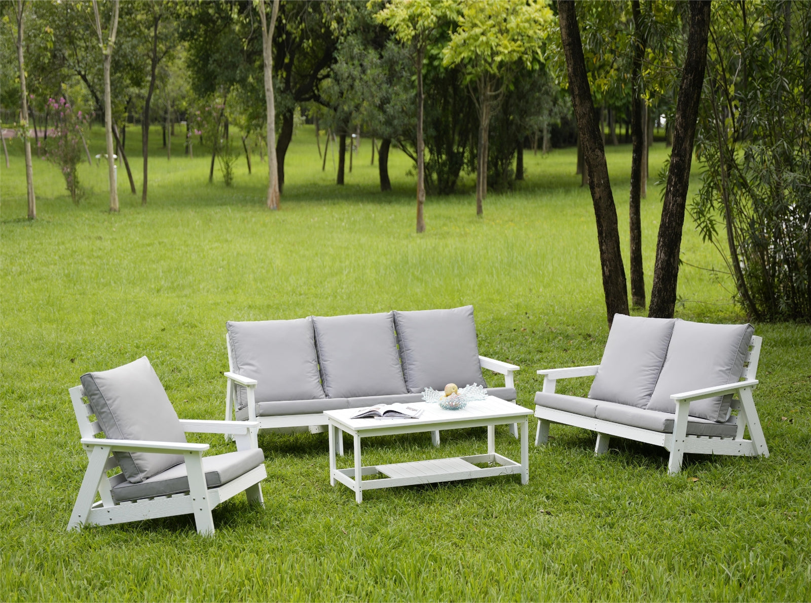 This outdoor sofa set features HIPS frames that are lightweight and easy to move, making it suitable for various settings such as patio, poolside, and garden. With a heat-treated wood grain coating, they offer the natural look of wood without the maintenance.
