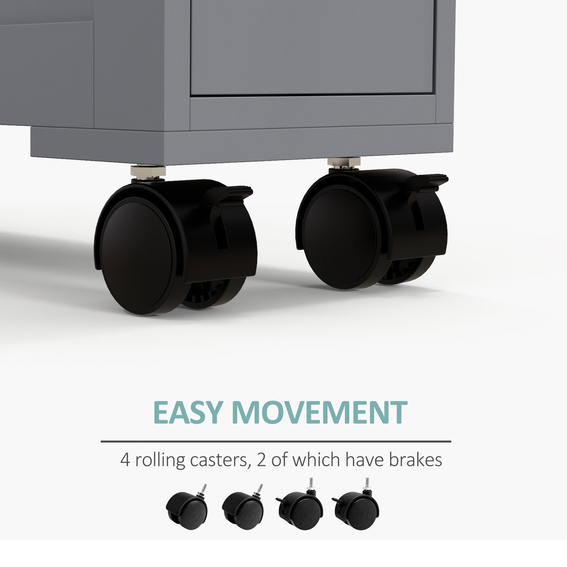 Are you looking for more bathroom storage but don't think you have the room? Maximize space and minimize clutter with a portable slide-out floor cabinet from HOMCOM. It's freestanding and narrow enough to fit in almost anywhere where cabinets or drawers might be impossible or impractical and will keep all of your bathroom accessories hidden away but still within reach. It's perfect for a smaller or second bathroom or just as a modern looking solution to common storage problems anywhere. Features: - Portable slide-out bathroom floor cabinet helps you to minimize clutter and organize space - An ideal way to store toiletries, cleaning products, and bathroom accessories out of plain sight - Constructed of durable MDF board with painted surface for long-lasting use and easy clean up - Stylish, modern design with a minimal footprint to fit into any bathroom style or size - Slide-out drawers and multiple compartments offers plenty of space for all of your things - Drawers with silver knobs for easy opening and closing - Easy assembly required Specification: - Color: White - Material: MDF - Overall Dimension: 6.75" W x 19" D x 22.75" H -Top Nook Size(Inner): 6" W x 7.75" D x 3.5" H - Small Drawer Size: 4.75" W x 8.5" D - Bottom Drawer( Right Part Shelf ) Size: 4.75" W x 11.5" D - Bottom Drawer( Left Part Shelf ) Size: 4.75" W x 4.75" D - Weight Capacity: 44lbs Are you looking for more bathroom storage but don't think you have the room? It's freestanding and narrow enough to fit almost anywhere where cabinets or shelves might be impossible or impractical and will keep all of your bathroom accessories hidden away but still easily within reach. The design is perfect for a smaller or second bathroom or just as a modern looking solution to common storage problems anywhere in the home. Features: - Portable slide-out bathroom floor cabinet helps you minimize clutter and organize space - Ideal way to store toiletries, cleaning products, and bathroom accessories out of sight - quality engineered wood with painted surface for long-time use and easy clean up - Stylish, modern design with a minimal footprint to fit into any bathroom - Open shelf and 2 drawers offers plenty of space for all of your things - Novel groove design at the back, provide some privacy for hiding things - 4 rolling casters (2 with safety latches) makes it easy to move - Quick and easy assembly required Specification: - Color: Gray - Material: MDF - Overall Dimension:6.25"W x 20.5"D x 28.25"H - Open Shelf Size:6.25"W x 17.5"D x 5"H - Drawer Size: 4.75"W x 15.75"D x 4.75"H - Height with Wheels: 28" Height without Wheels: 26" - Weight Capacity: 45lbs - Item Label: 834-180V81GY Package Includes: - 1 x Bathroom Side Cabinet - 1 x Instruction.