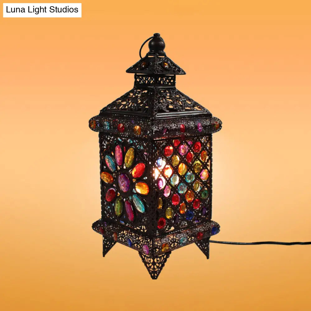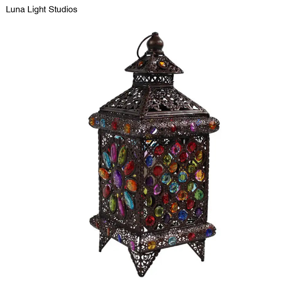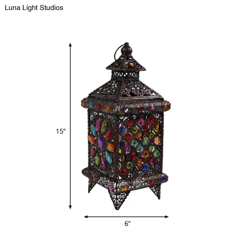 مصباح طاولة عتيق بمصباح واحد على شكل فانوس معدني نحاسي لغرفة المعيشة