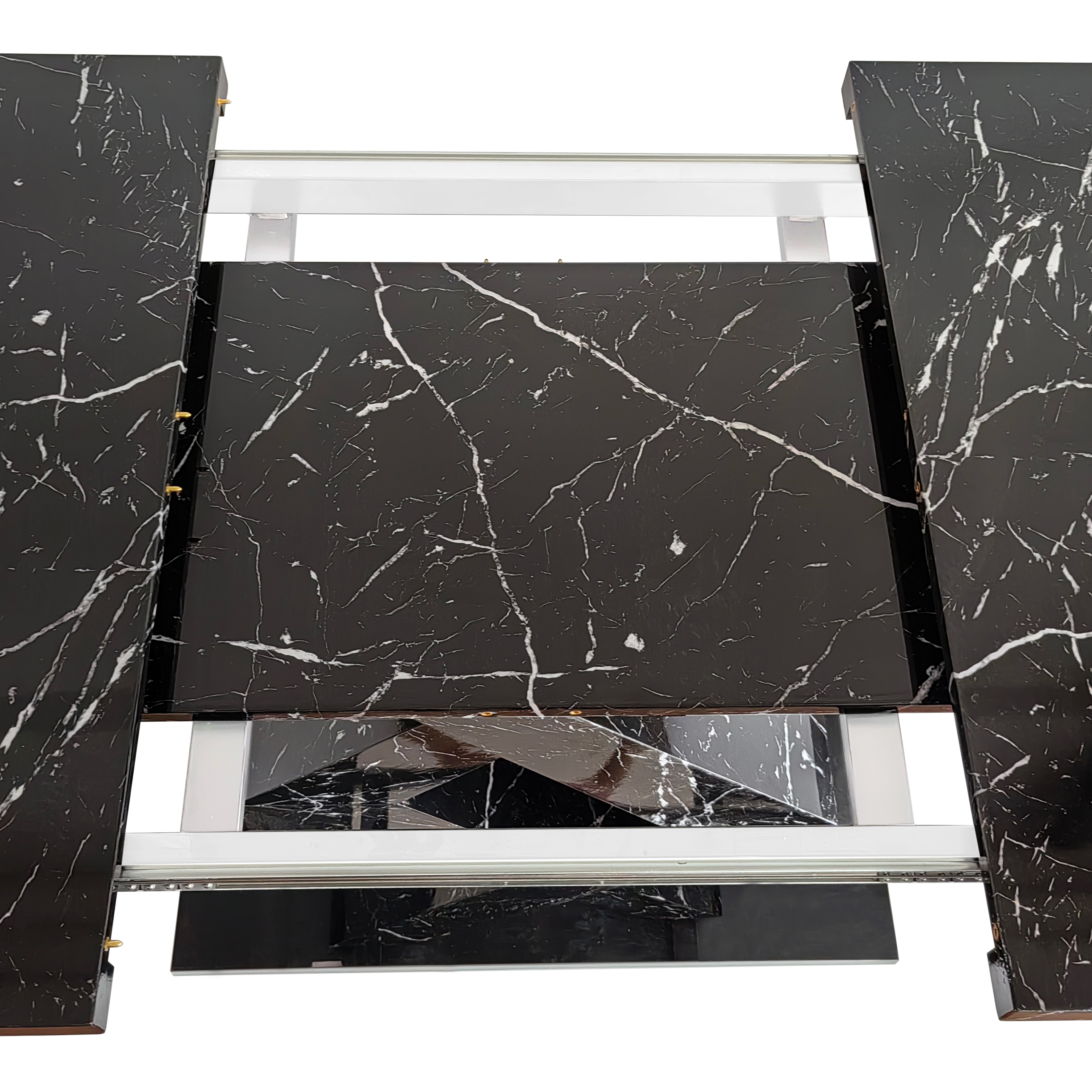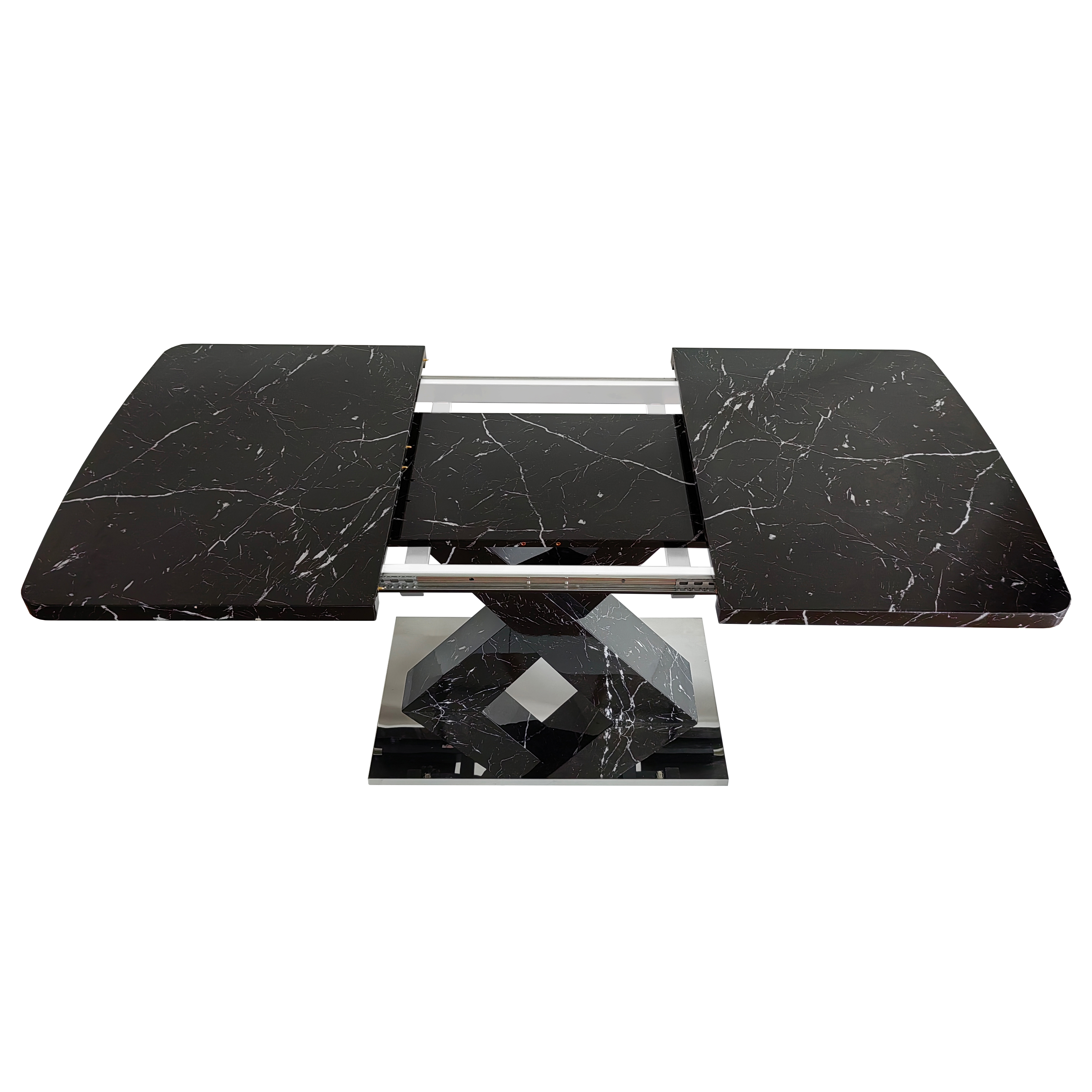 Modern Rectangle Dining Table Stretchable,Printed Black Marble Table Top MDF X-Shape Table Leg With Metal Base