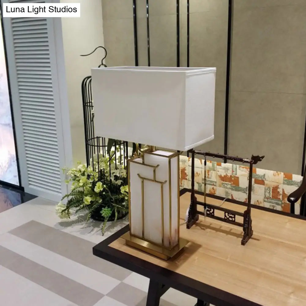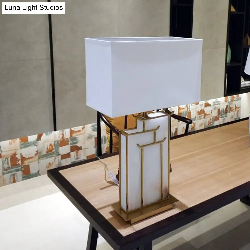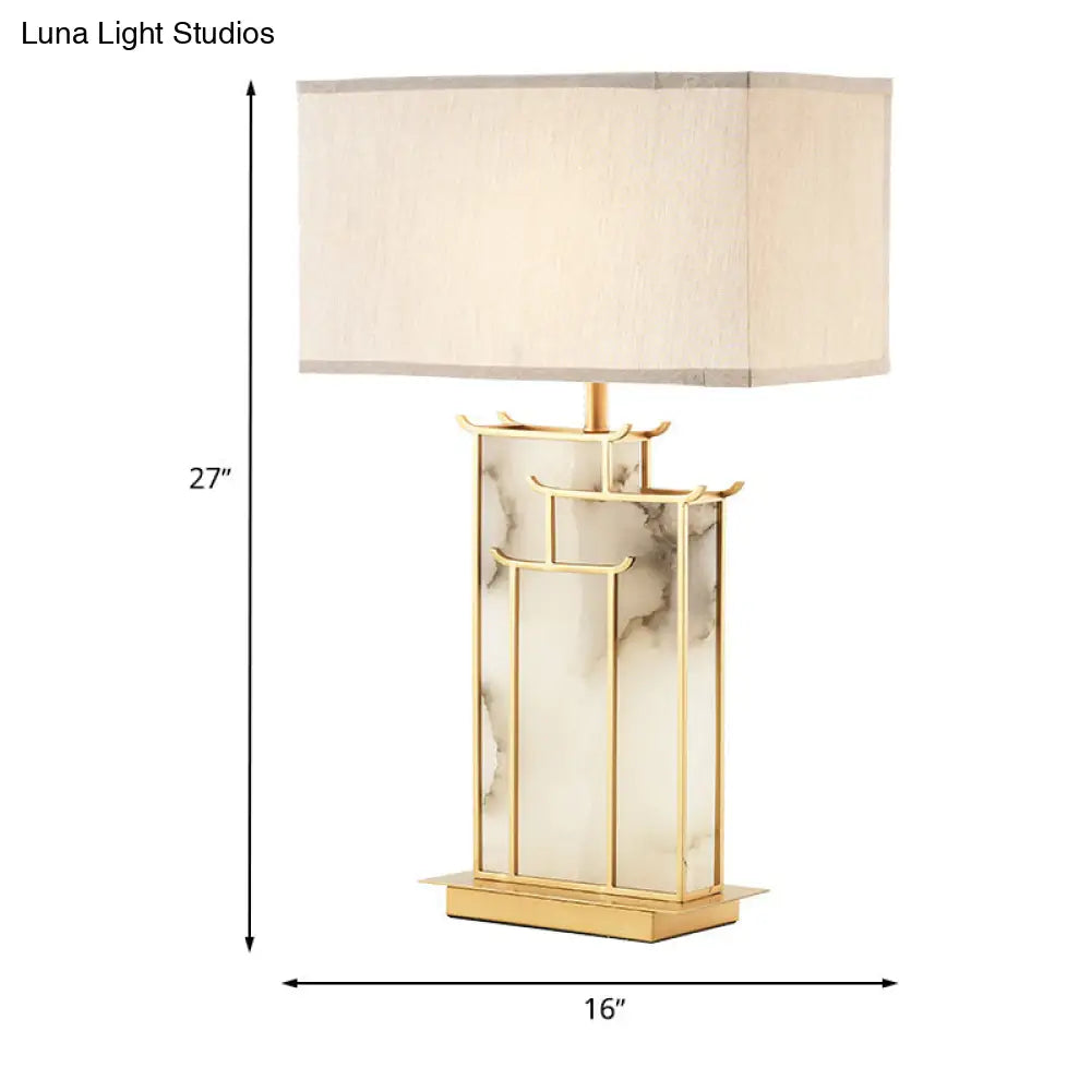 مصباح طاولة مستطيل معاصر من القماش بإطار ذهبي ولوحة رخامية مزخرفة - إضاءة عمل بيضاء، لمبة واحدة