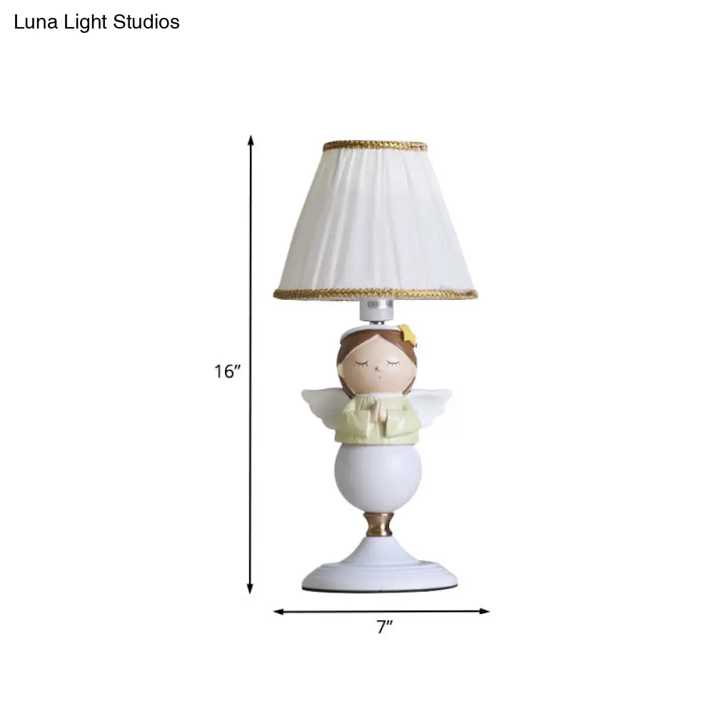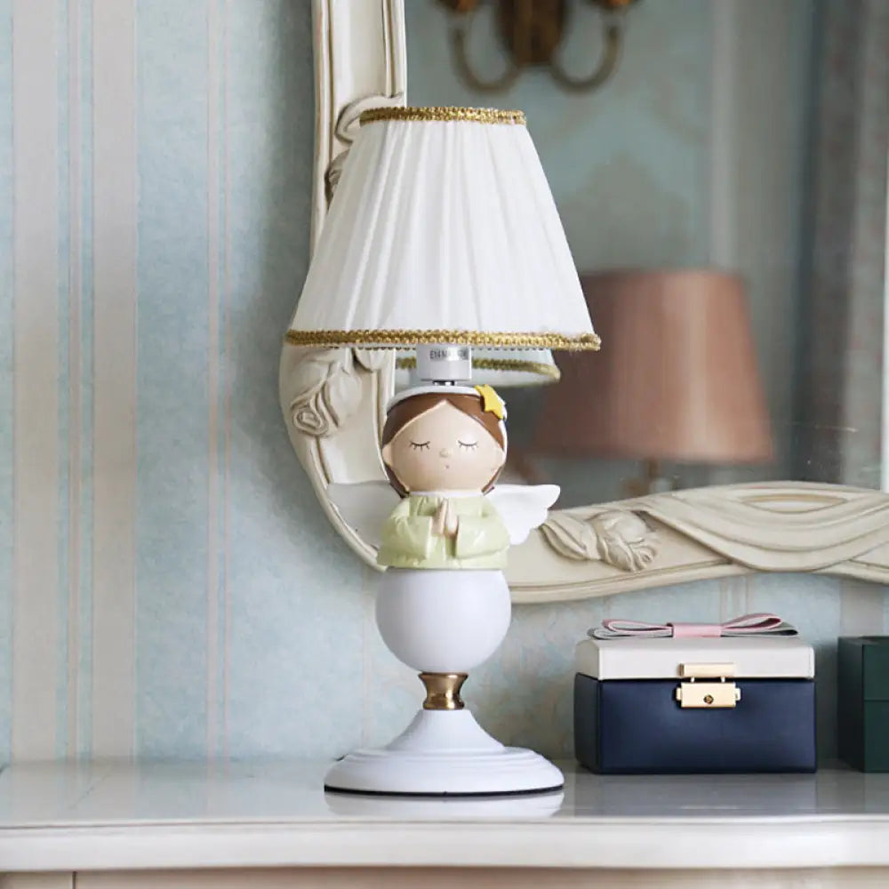 مصباح طاولة ليلية على شكل ملاك من الراتينج الكرتوني مع لمبة واحدة وغطاء قماشي أبيض على شكل دلو