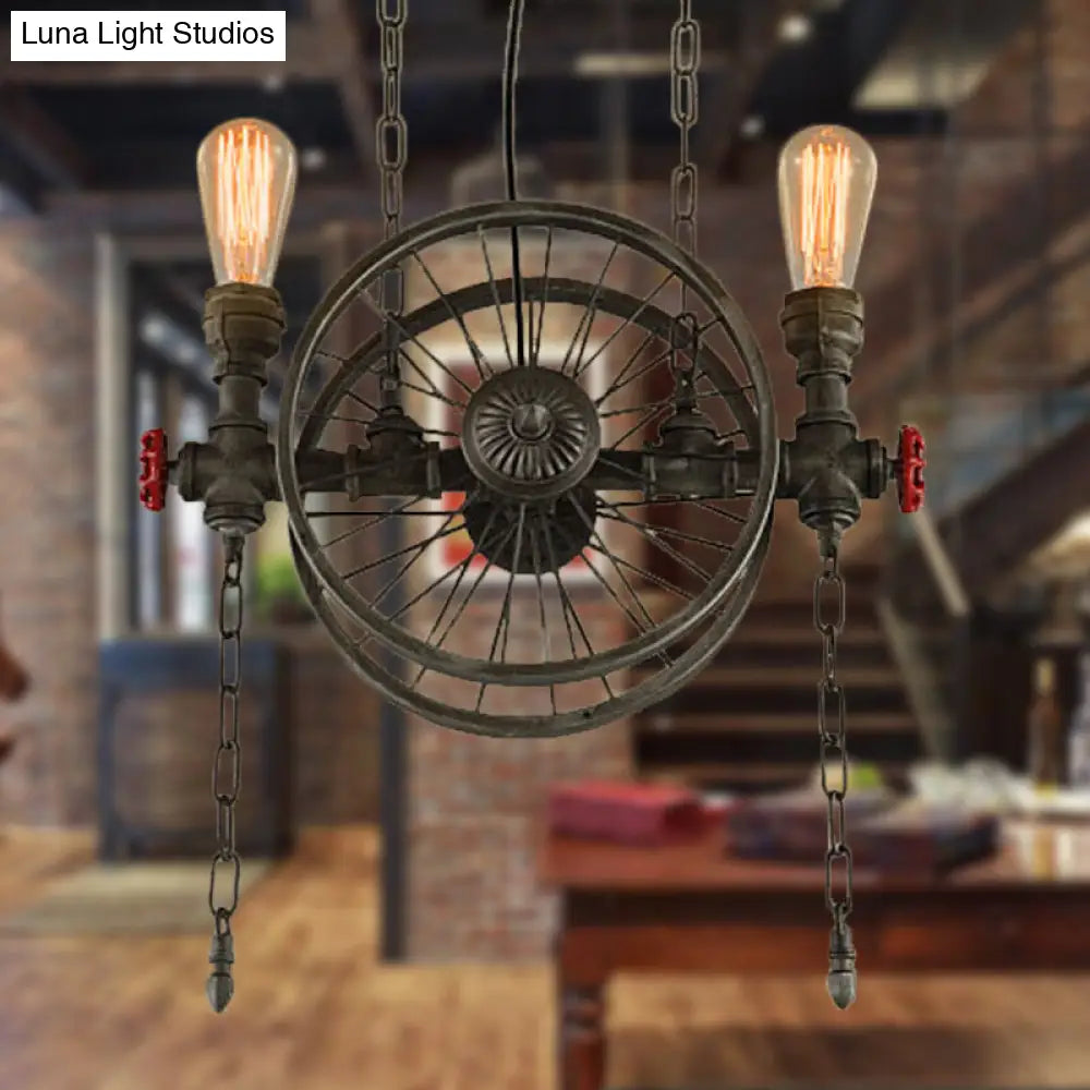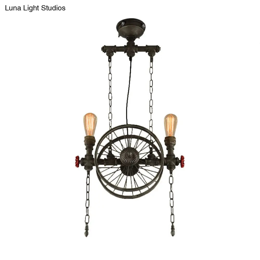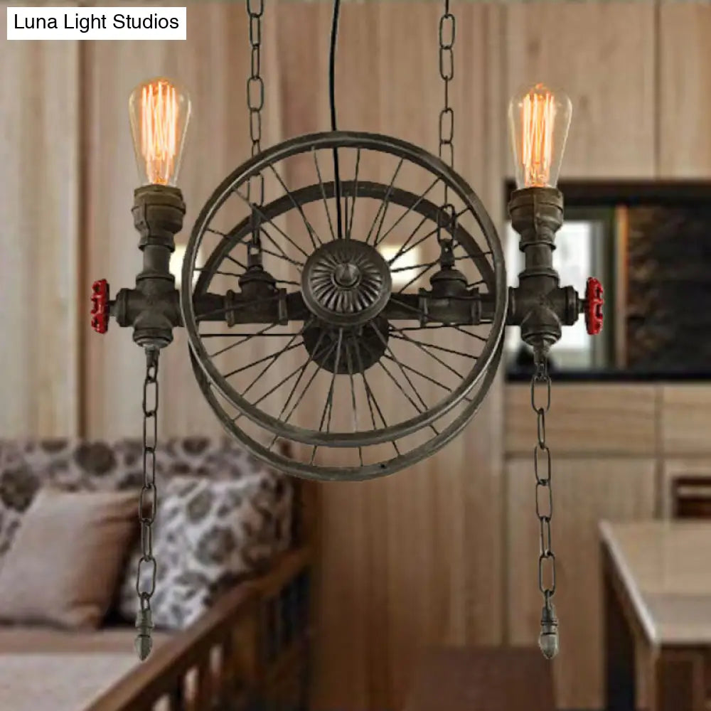 مصباح معلق ريفي مكشوف على شكل عجلة، ثريا من الحديد المطاوع، مزودة بمصباحين باللون البرونزي