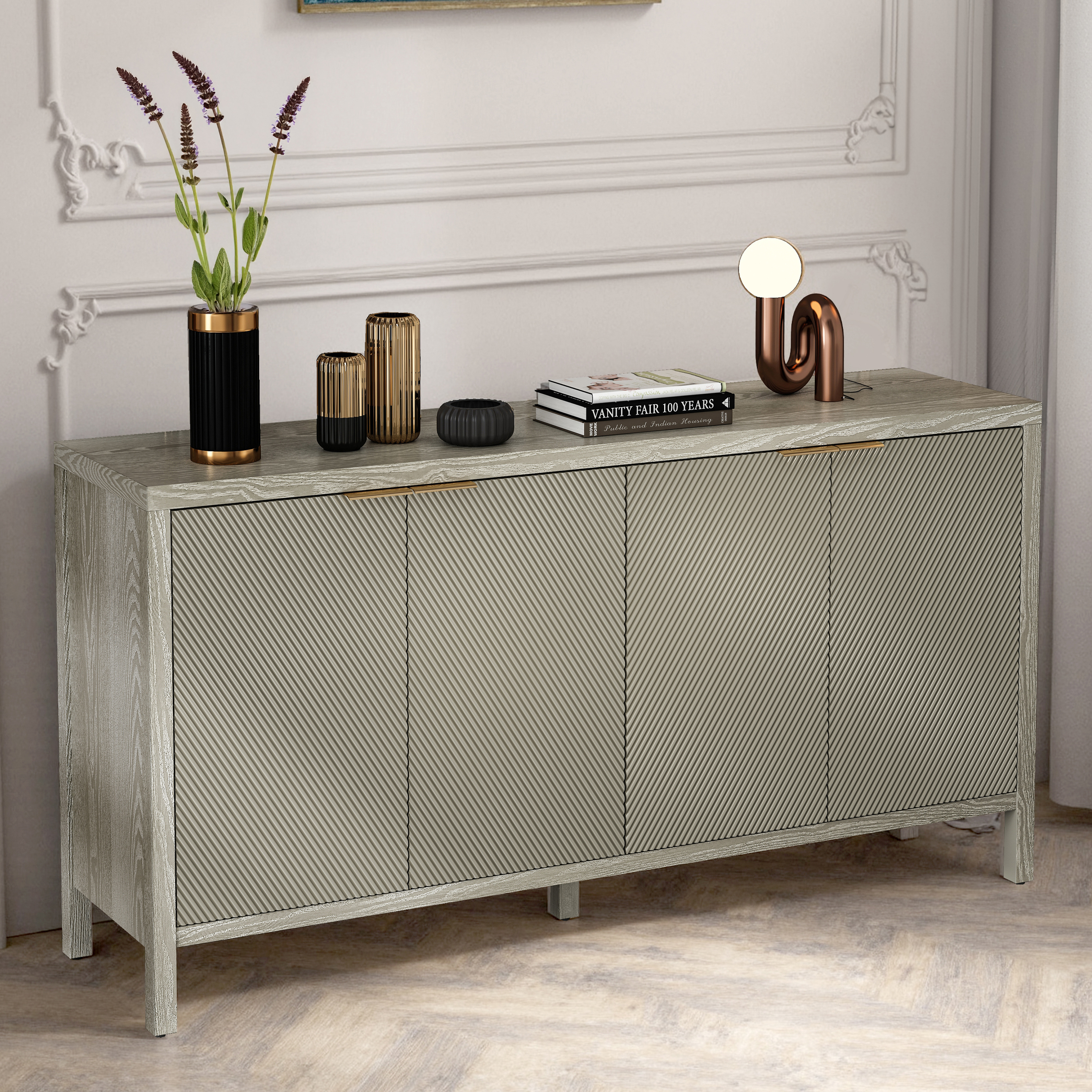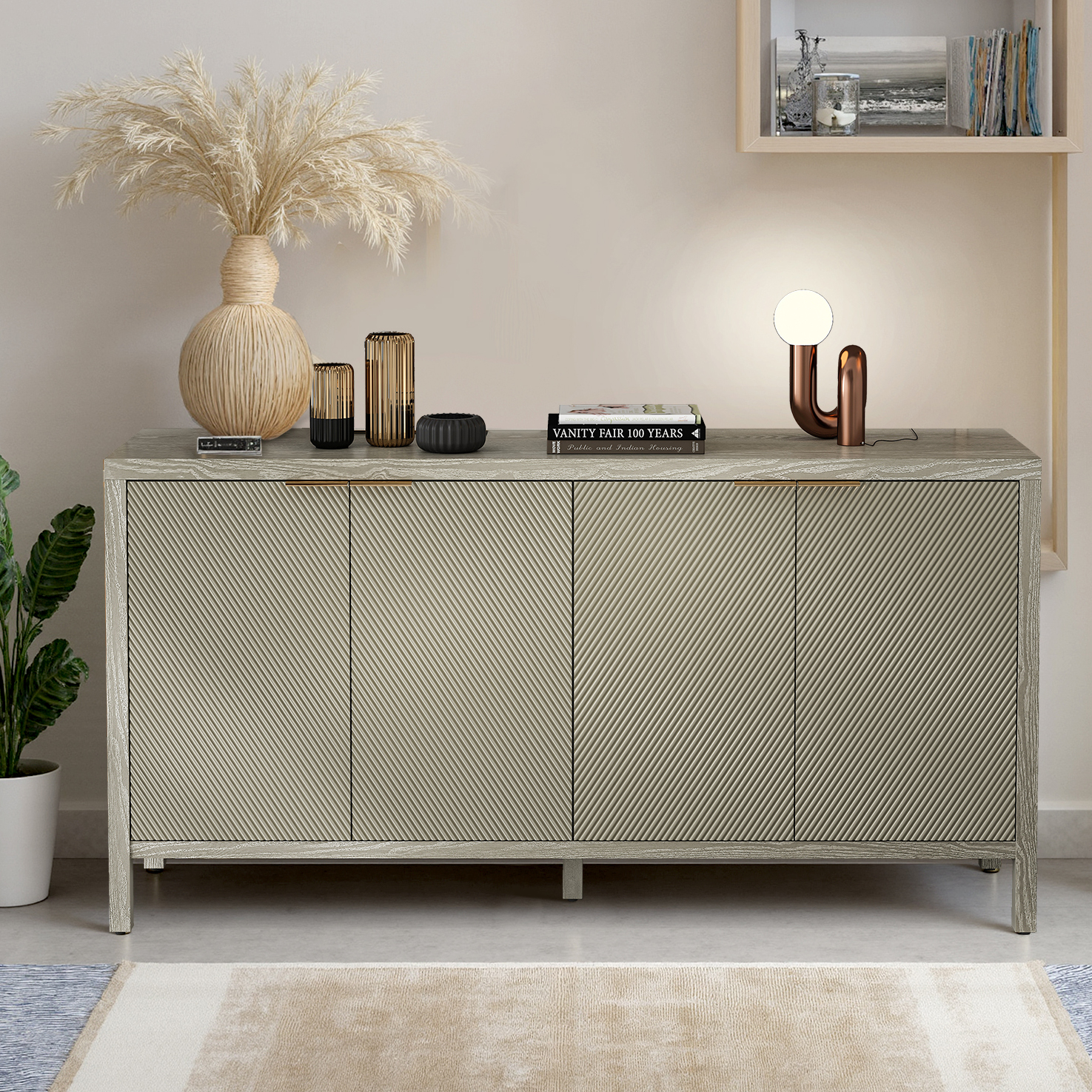 - MODERN DINING SIDEBOARD: This 59-inch buffet features fully concealed hinges to maintain a minimalist look, and the four doors are designed with a beautiful and unique embossed pattern for a modern aesthetic, perfect for high-end home decor; it can be used as a sideboard in the dining room, a TV stand or a decorative cabinet in the living room, an entryway table with storage, or a display cabinet in the office.