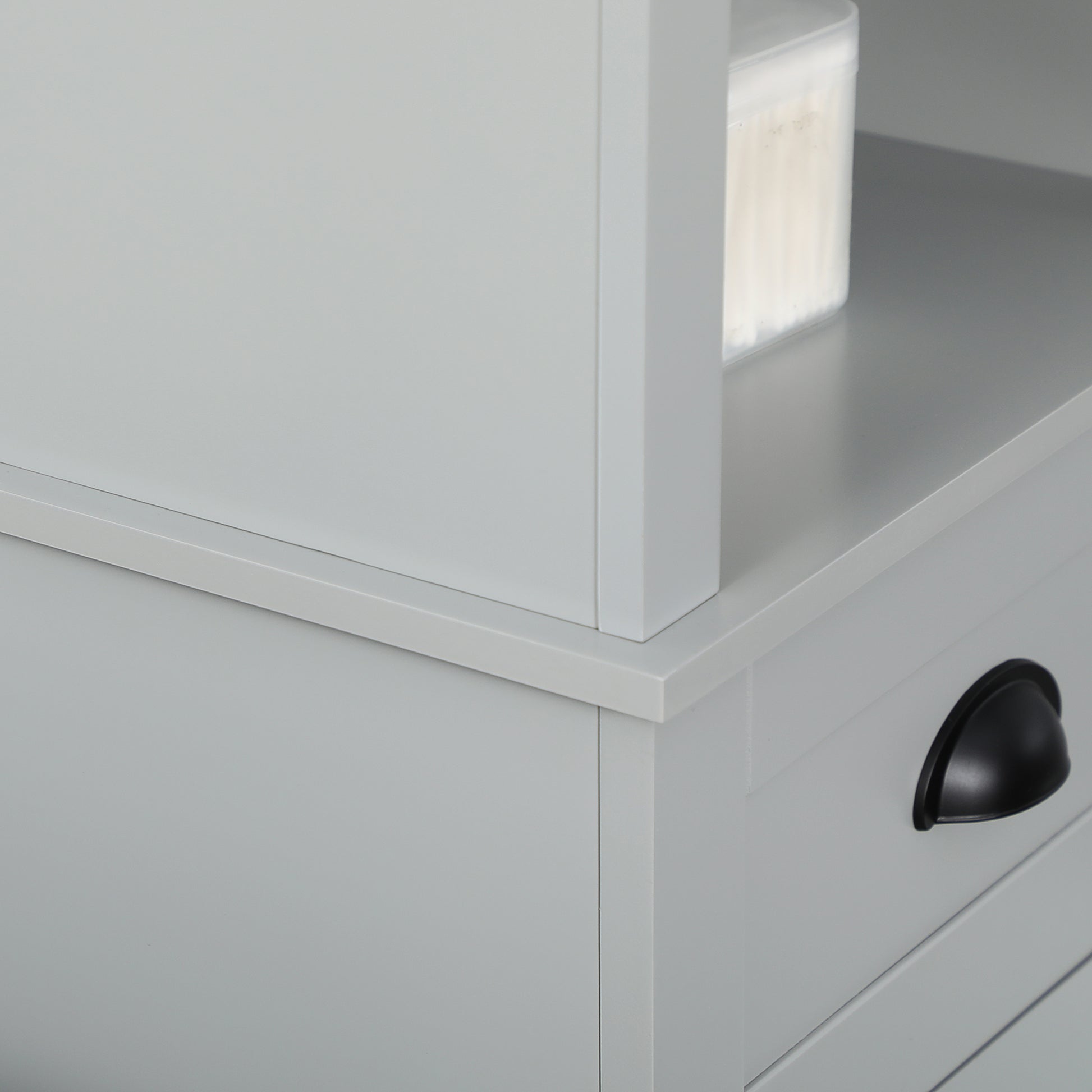 When you're stuck with a bathroom that doesn't accommodate all your items, this skinny storage cabinet fits into those tight corners that otherwise get left empty. A combination of enclosed cabinet, drawer and open shelving lets you grab things sitting out or stock items behind doors. Provide a spot for daily hygiene products, cleaning supplies, or towels, keep what you need close by for when you need it with kleankin slim bathroom cabinet. Features: - Open shelves, enclosed cupboard and 1 drawer- Adjustable shelves give you flexibility in personalizing the storage compartments - Anti-tipping design ensures safety - The water-friendly surface is melamine-coated, smooth, and easy to clean - Assembly required Specification: - Color: Gray - Materials: MDF, Glass - Overall Dimensions: 15" W x 11.75" D x 67" H - Open Shelf Dimensions: 12.75" W x 10" D x 9.25" H (Each Tier) - Shelf inside Cabinet Dimensions: 12.75" W x 10" D x 11.25" H (Each Tier) - Drawer inner Dimensions: 11.5" W x 9" D x 4.25" H - Weight Capacity: 110 lbs. (Total), 22 lbs. (Each Shelf) - Item Label: 834-543V80GY Package Includes: - 1 x Bathroom Cabinet - 1 x Manual.