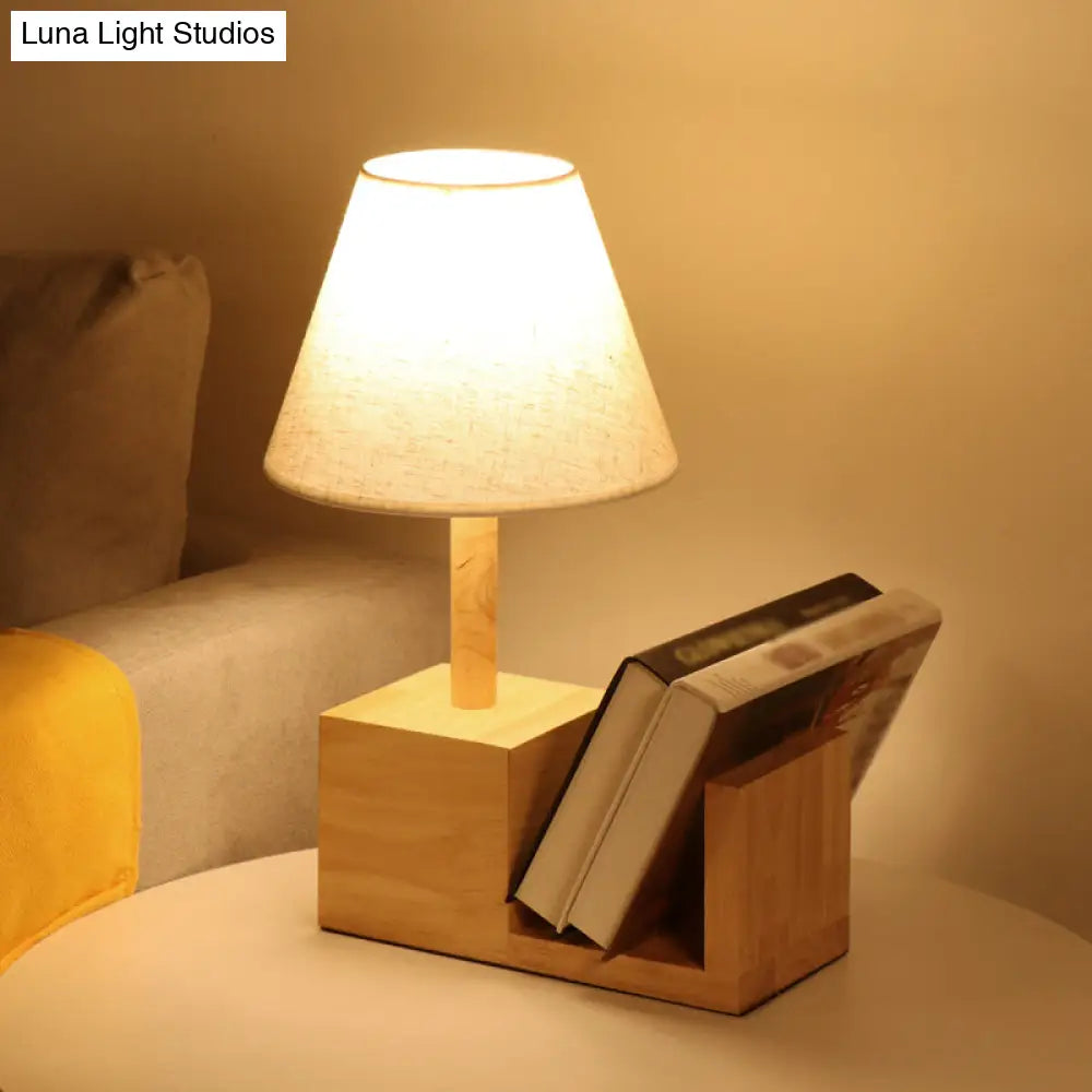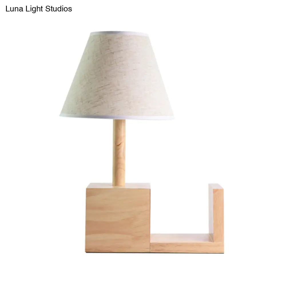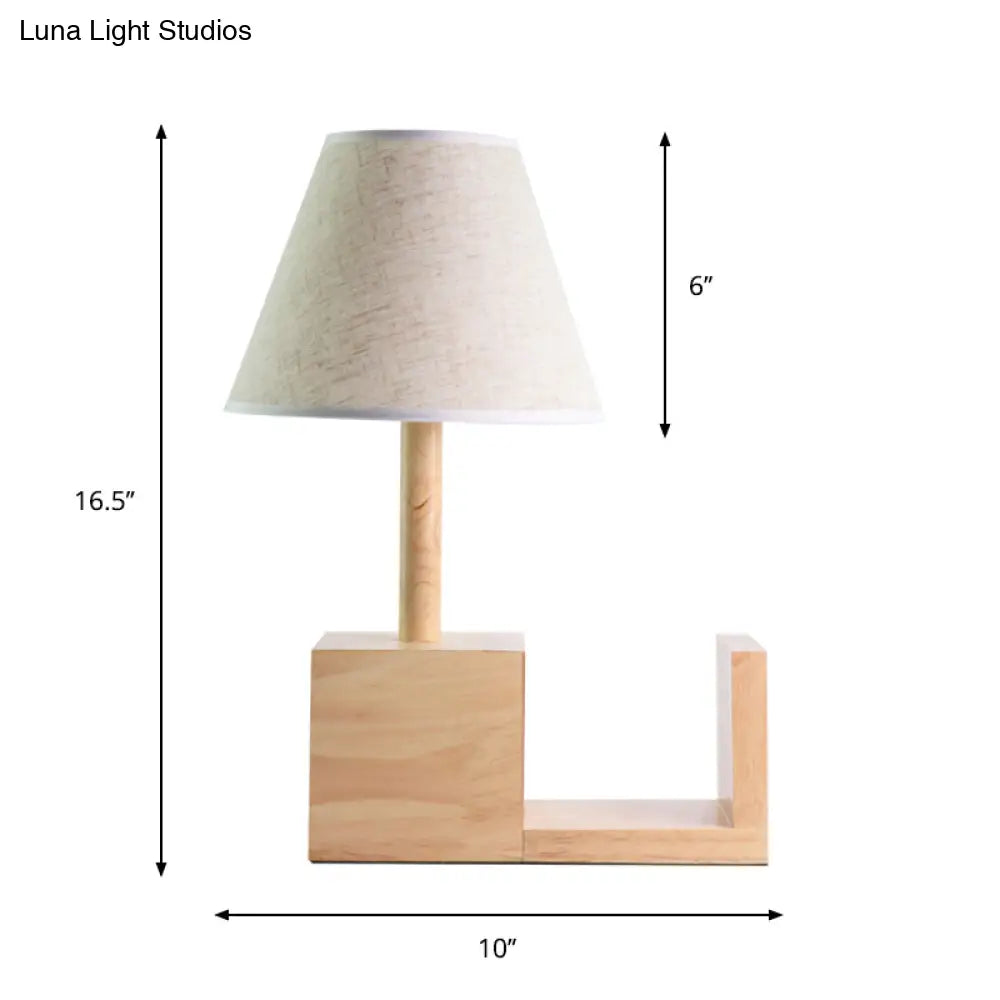 مصباح طاولة ليلية عصري من القماش المدبب - مصباح مكتب أبيض برأس واحد وقاعدة رف خشبية